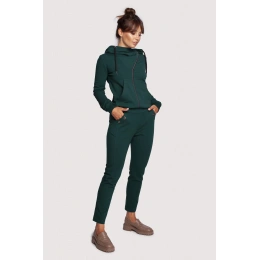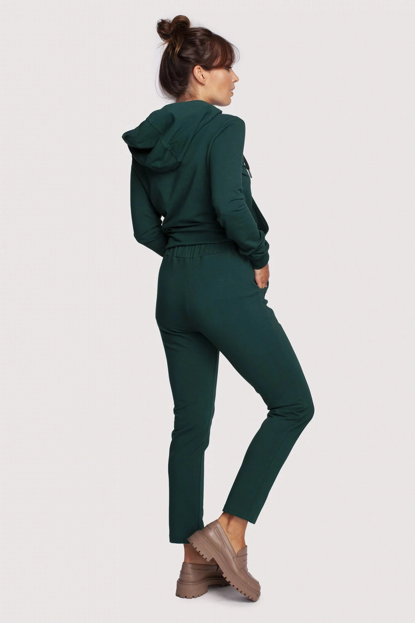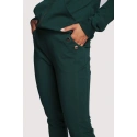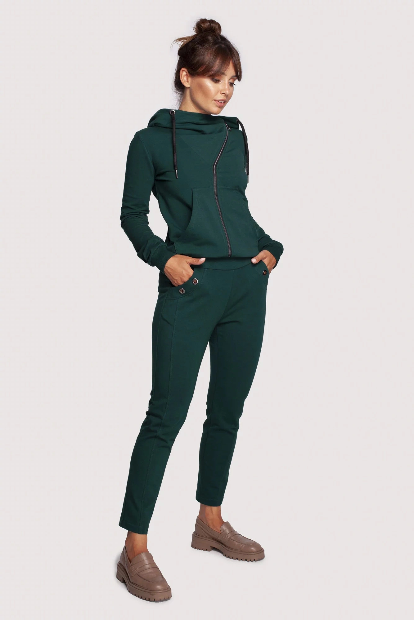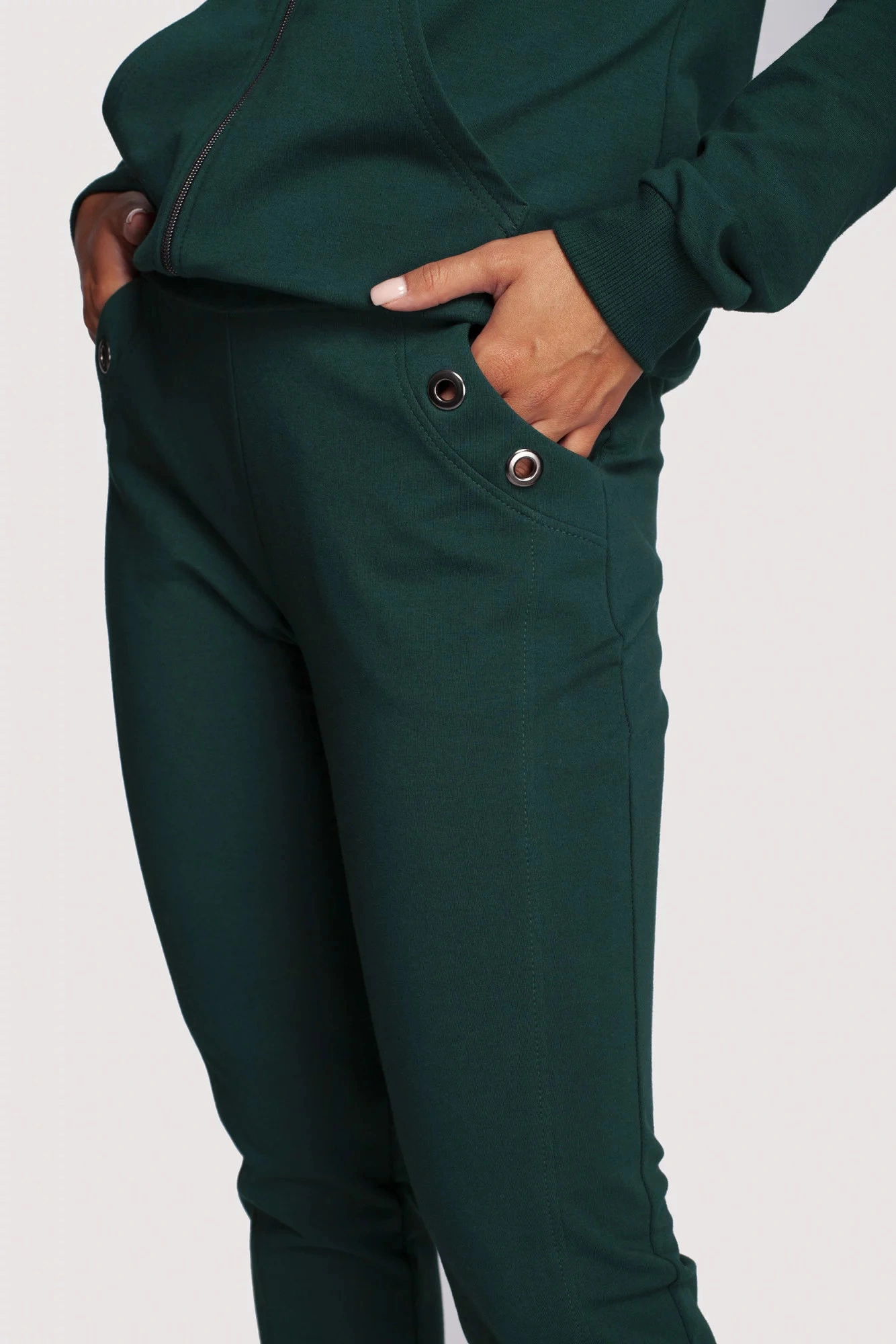 Uniwersalne spodnie z prostymi nogawkami ozdobione przednimi szwami i ozdobnymi oczkami na kieszeniach.