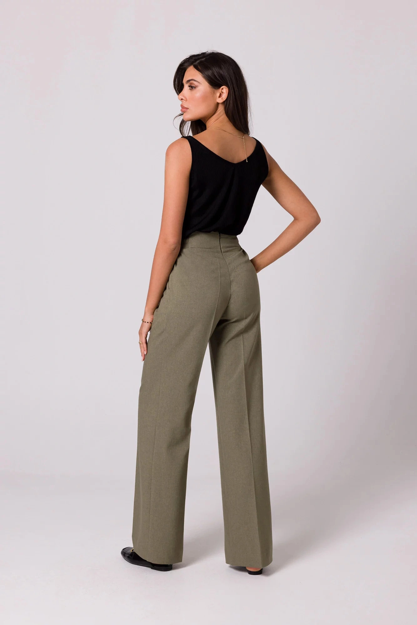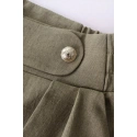 Pokochasz design tych lekkich spodni - szerokie nogawki z zakładkami, częściowo elastyczny pas i ozdobne złote guziki z przodu.