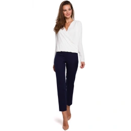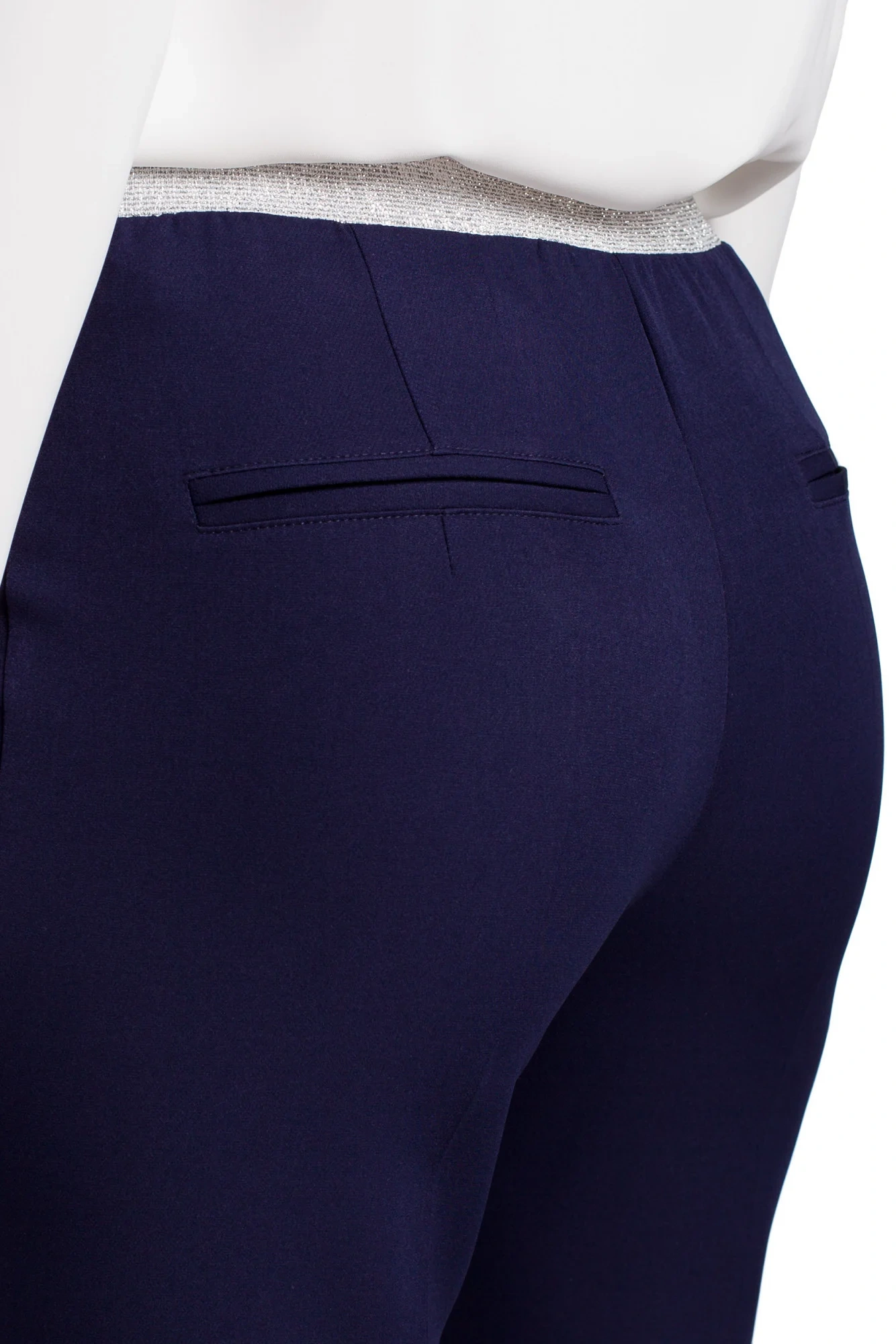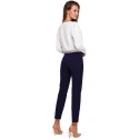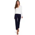 Nowoczesne spodnie w stylu chino z rozszerzanymi prostymi nogawkami i elastycznym paskiem w talii sprawdzą się zarówno w pracy, jak i podczas wieczornego wyjścia, w połączeniu z czółenkami na obcasie, T-shirtem i marynarką.