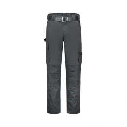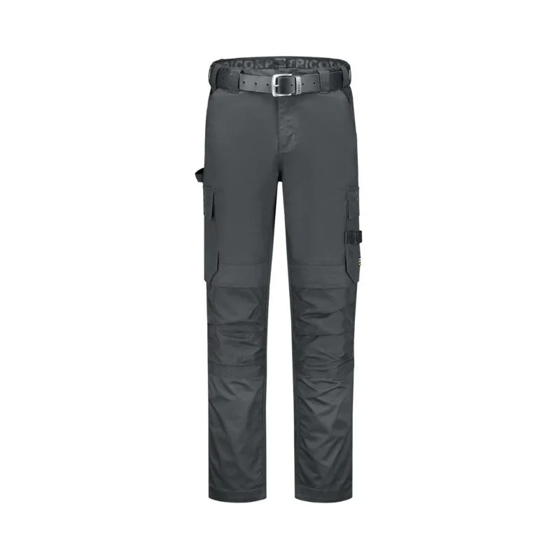 Spodnie unisex elastyczne w pasie, wielofunkcyjnych kieszeni, elementy odblaskowe, kolana wzmocnione bardzo wytrzymałym materiałem CORDURA®, możliwość wydłużenia nogawek, pasuje do nakolanników T90, rozmiary 45, 47, 49, 51, 53, 55 są przedłużone, pasek nie jest częścią zestawu, Tricorp kod produktu: 502021