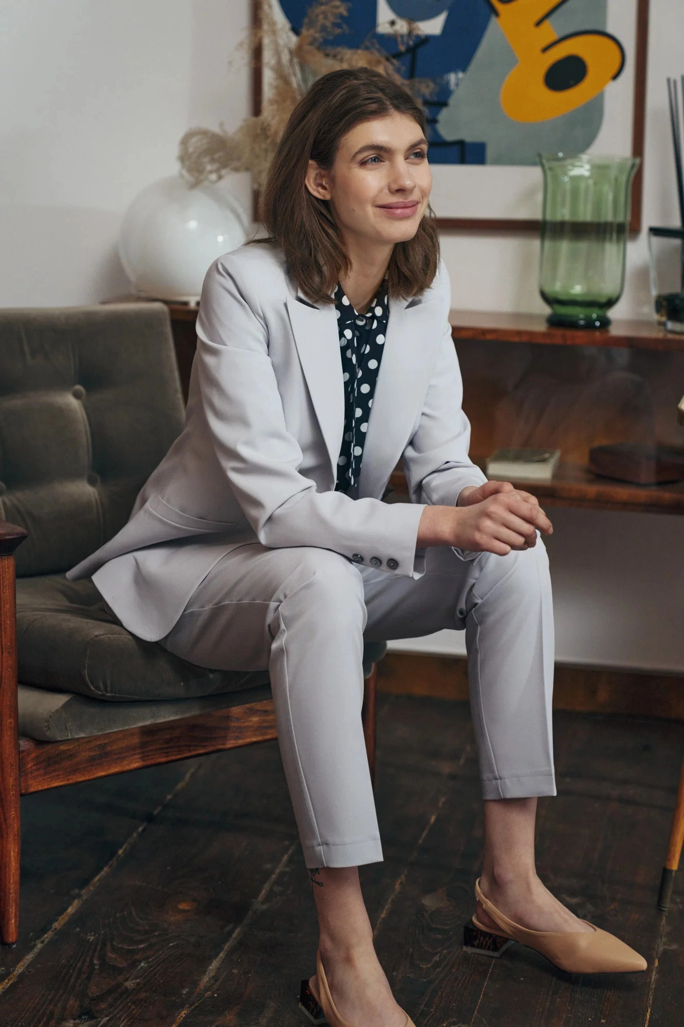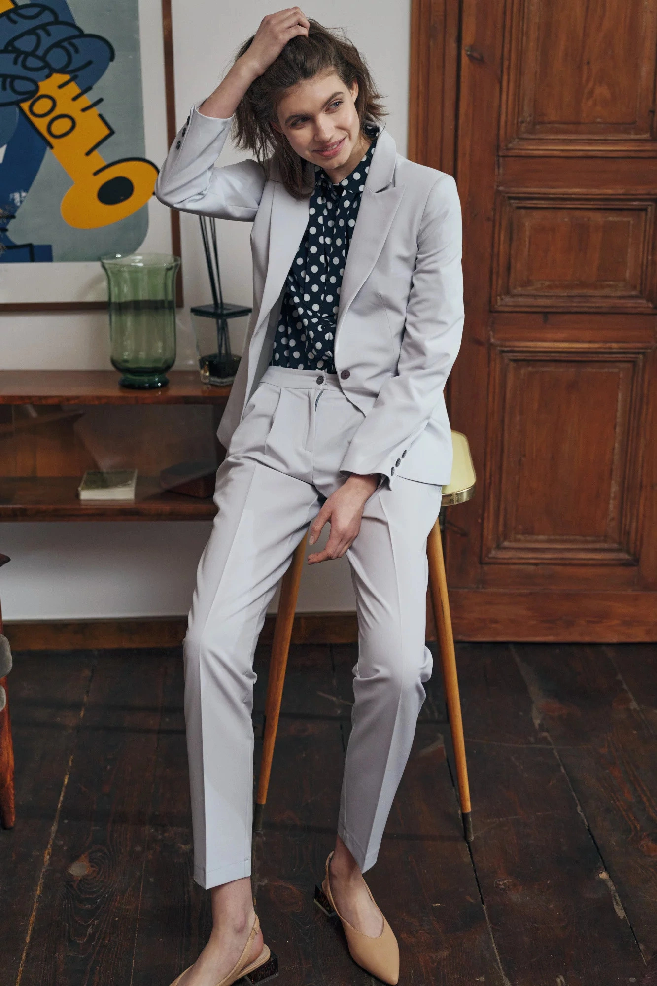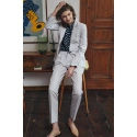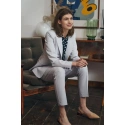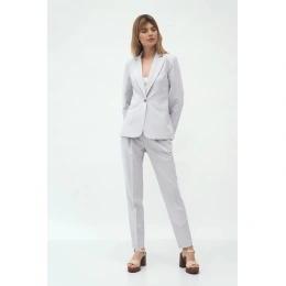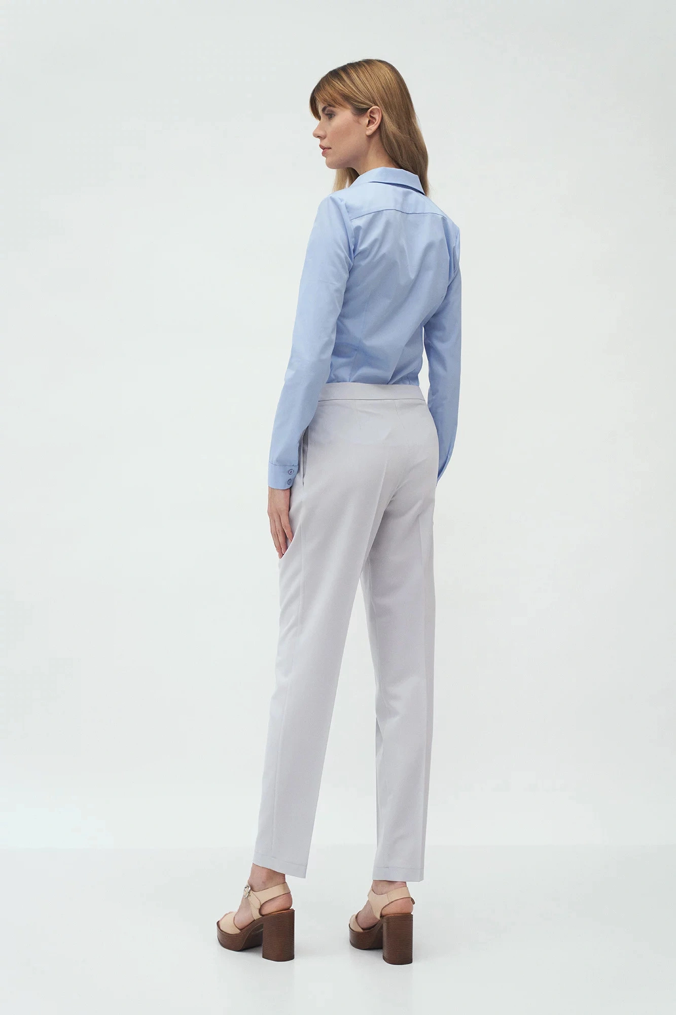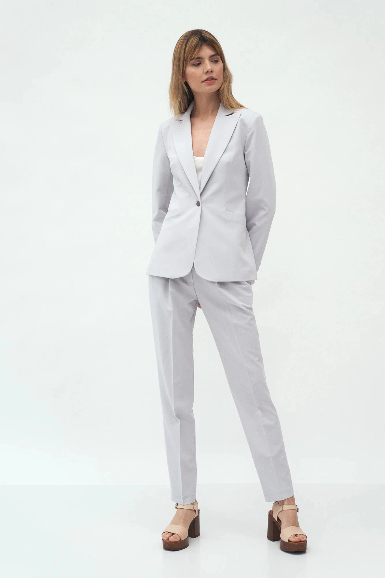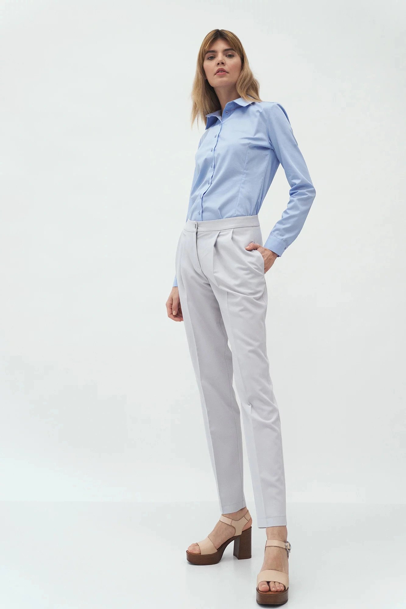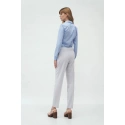 Spodnie o długości do kostek, regularna talia, zakładki z przodu, kieszenie boczne, klapa zapinana na zamek i guzik. Zwężane nogi z zagięciami.74,8% Poliester 23,1% Wiskoza 2,1% ElastanKolor: SzaryKolekcja: LatoPłeć: Kobieta