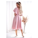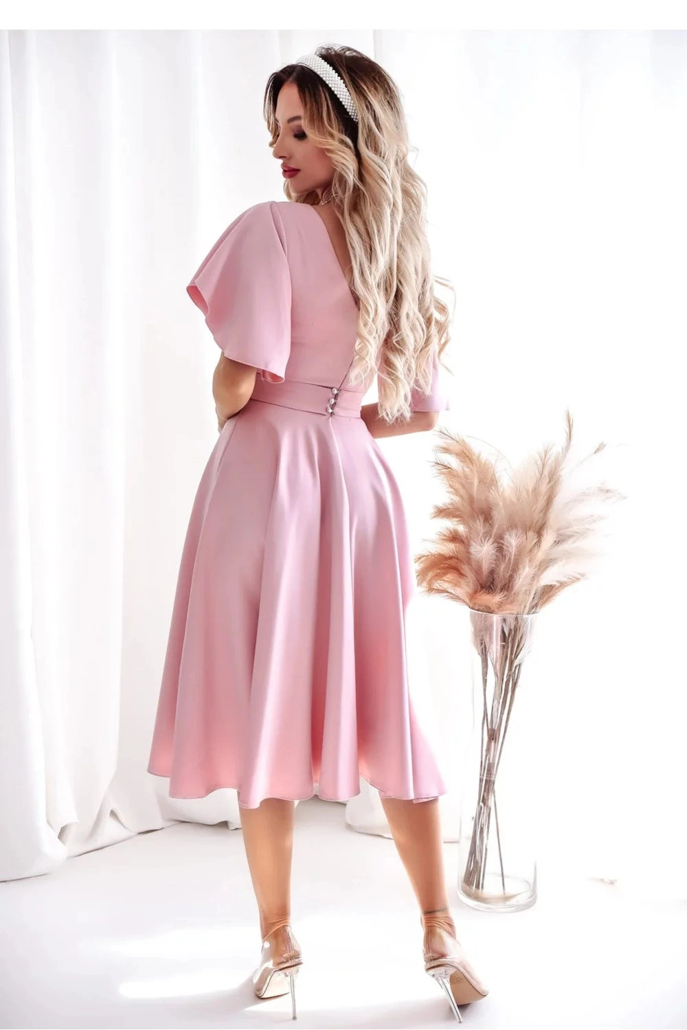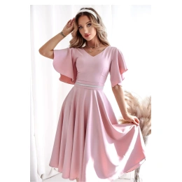 Elegancka sukienka w odcieniu brudnego różu to idealny wybór na specjalne okazje.Wykonana z wysokiej jakości materiału, doskonale dopasowuje się do sylwetki, podkreślając jej atuty.Model posiada dekolt w literę V, który delikatnie podkreśla szyję i obojczyki.Rękawy o luźnym, falbaniastym kroju nadają sukience lekkiego i romantycznego charakteru.Talia, ozdobiona lekkimi zdobieniami, dokładnie podkreśla sylwetkę.Rozkloszowany dół nadaje kreacji lekkości i elegancji.Sukienka zapinana na ukryty zamek błyskawiczny, zapewniający wygodę i idealne dopasowanie.Świetna na wesela, przyjęcia, chrzciny i inne eleganckie imprezy.