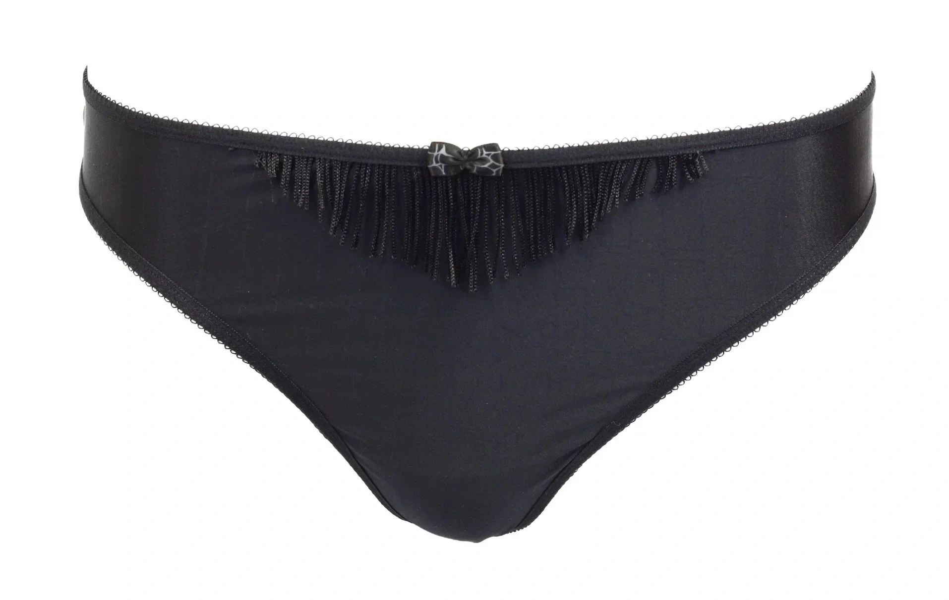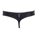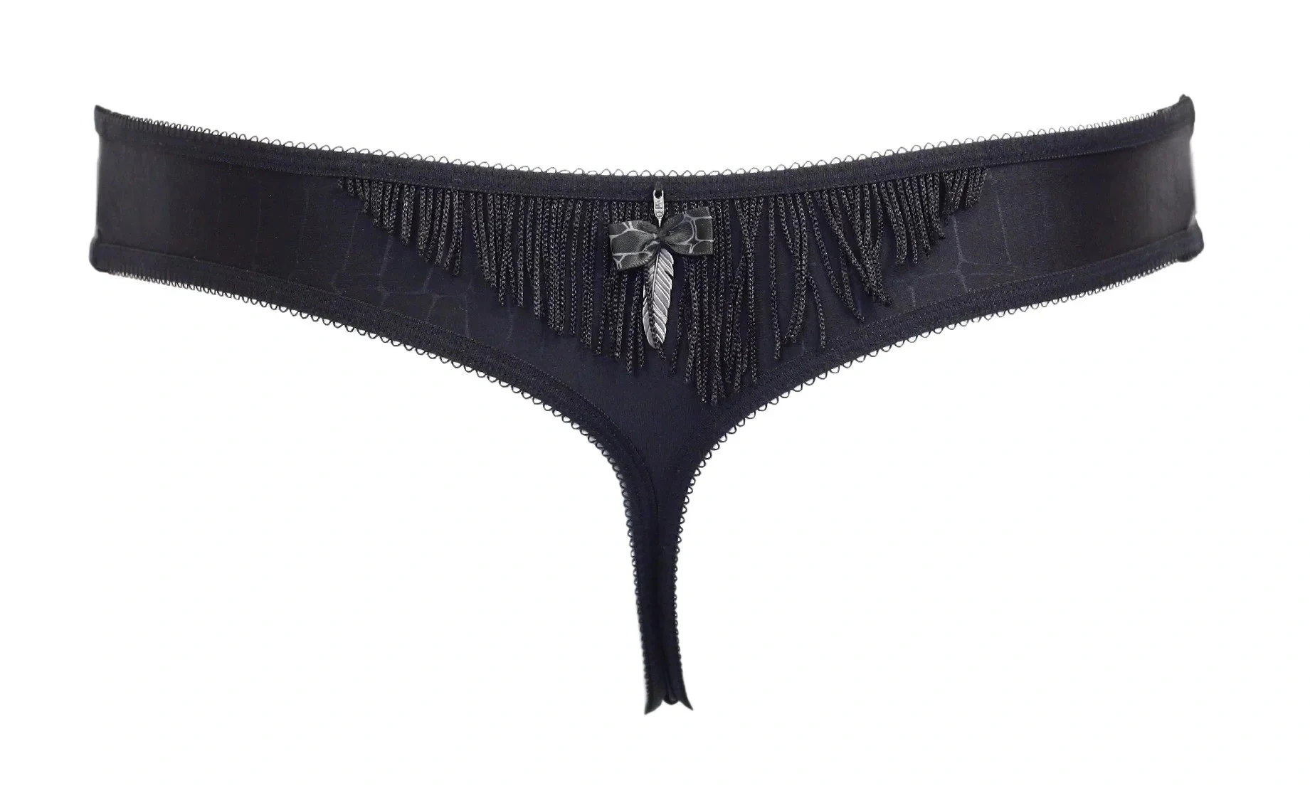 piękne stringi Marlies Dekkers. Gładka powierzchnia z wypalanymi ozdobnymi frędzlami z przodu i z tyłu majtek. Piękne srebrne pióro umieszczone z tyłu majtek.