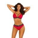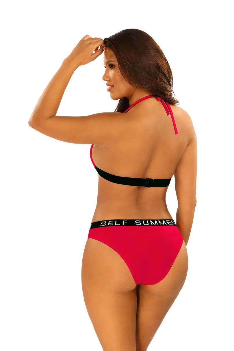 Dwuczęściowy kostium kąpielowy o sportowym kroju. Biustonosz ze wzmocnionymi, profilowanymi miseczkami. Ramiączka wiązane na szyi do kompletu z klasycznymi figami.