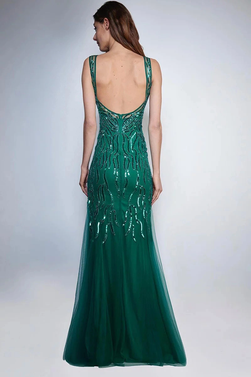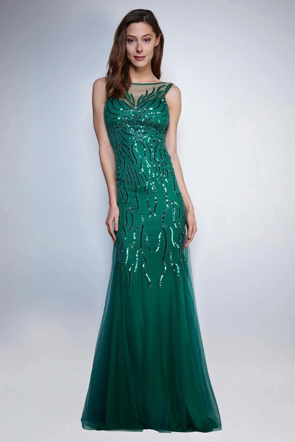 Piękna sukienka wieczorowa z długimi rękawami i okrągłym dekoltem. Górna połowa sukienki pokryta jes
