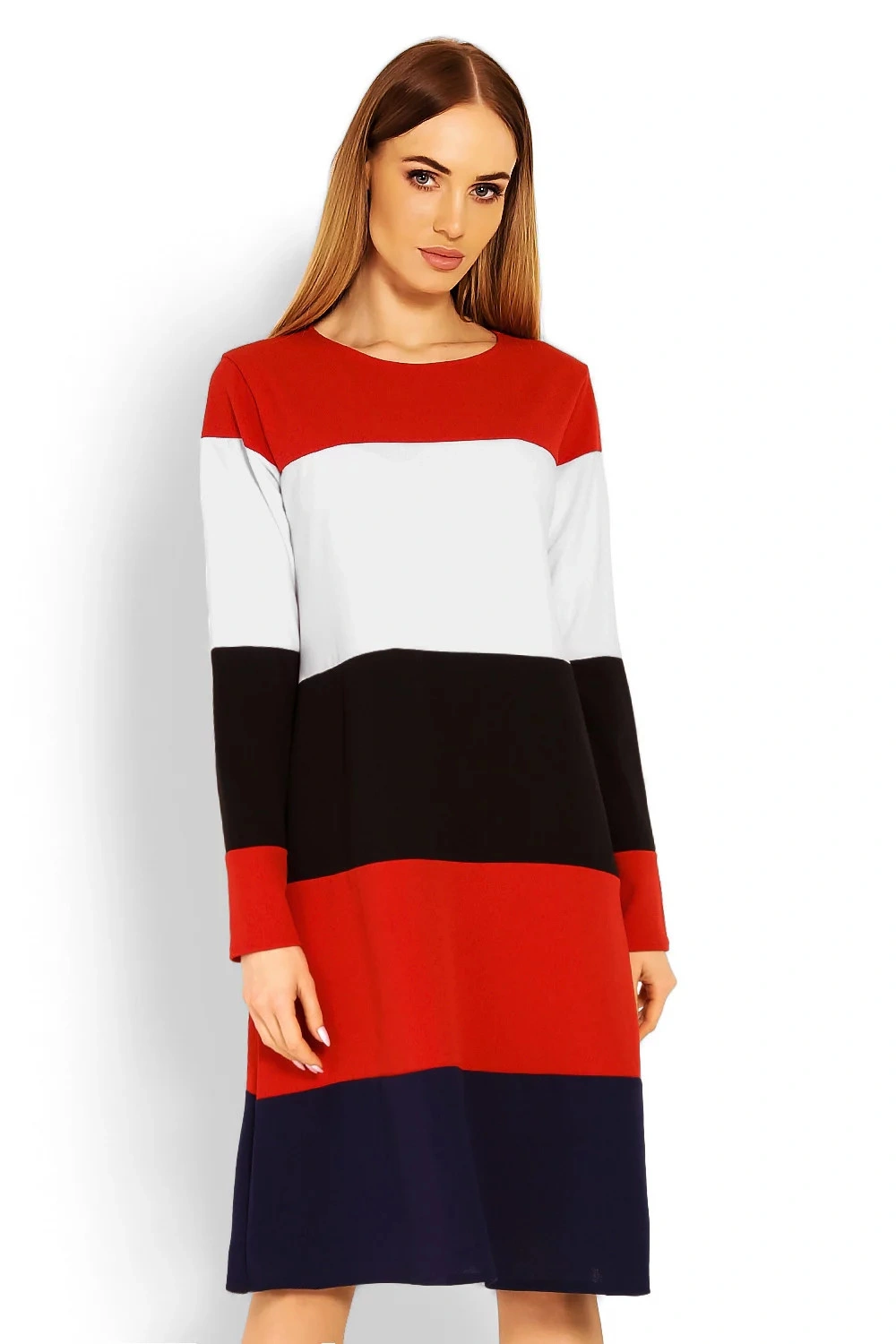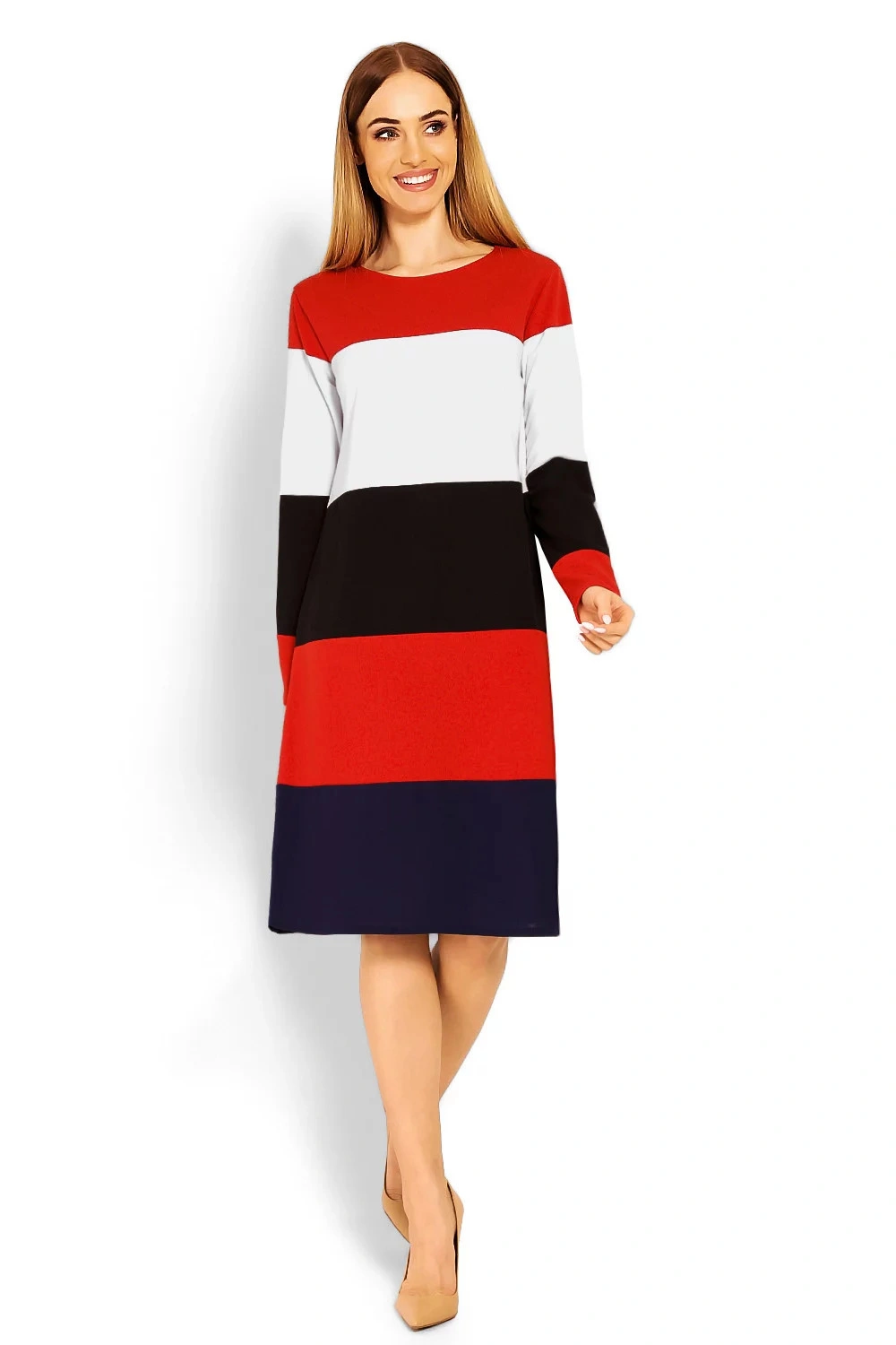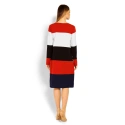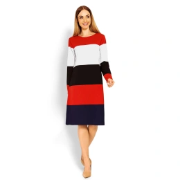 Postaw na sportową elegancję i wybierz prostą sukienkę w granatowe paski z kontrastowym dekoltem i k