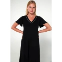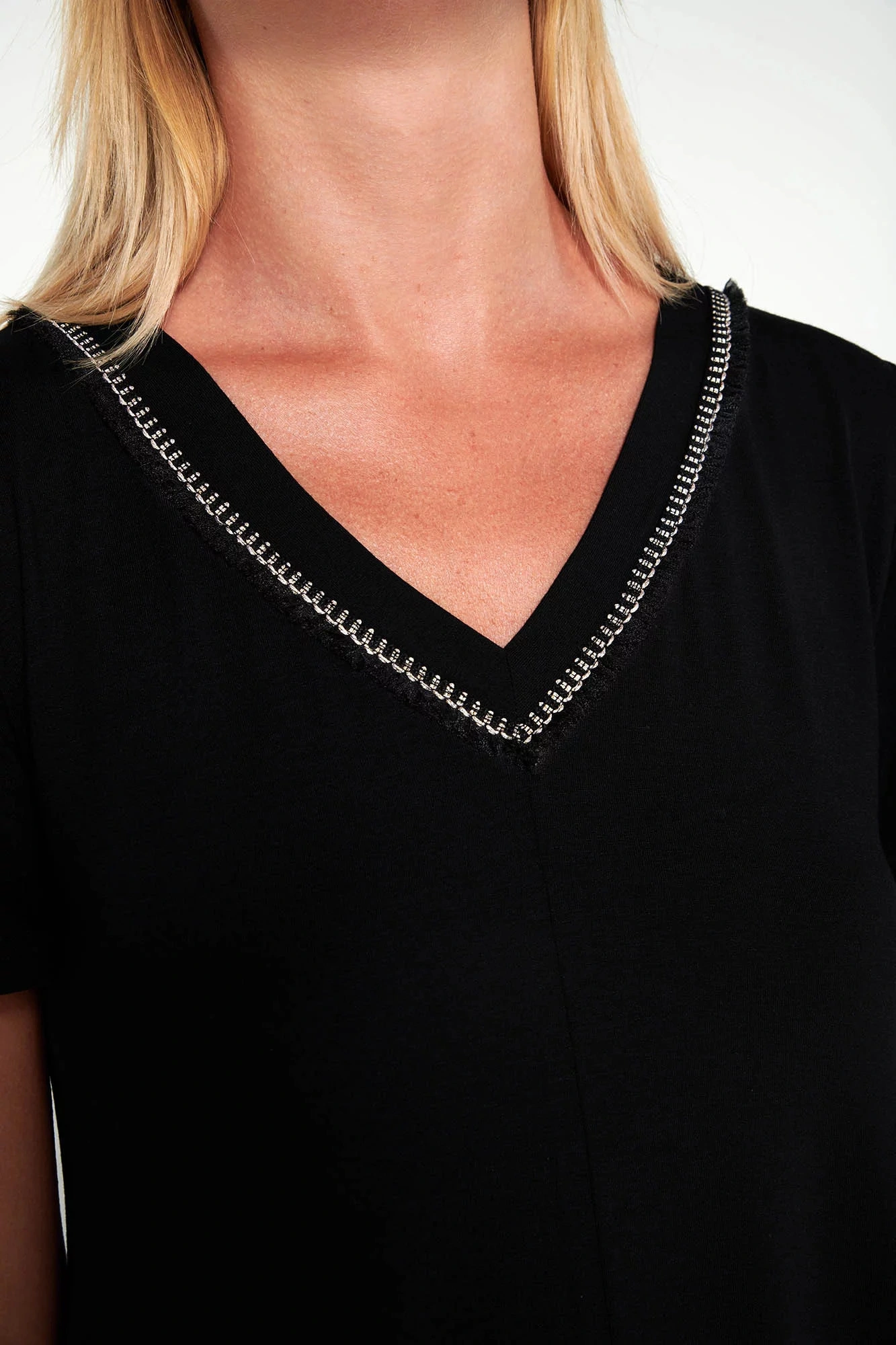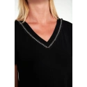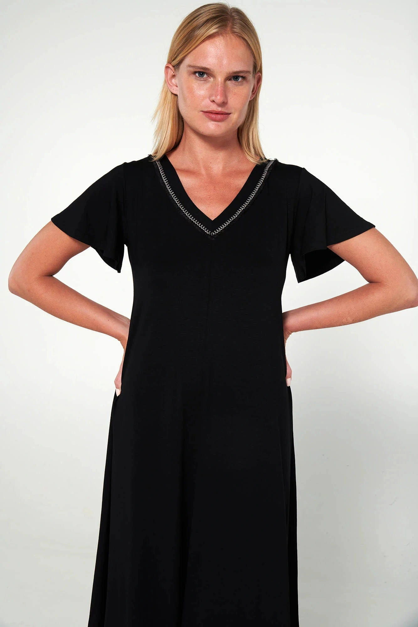 Sukienka z krótkim rękawem i dekoltem w kształcie litery V o luźnym kroju. Prosty fason, który zapewnia wygodę i elegancję na co dzień.