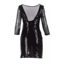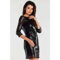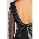 Sukienka jest wysadzana małymi błyszczącymi cekinami.