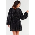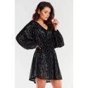 Damska krótka sukienka wizytowa z czarnymi cekinami. Elastyczna talia. Długie rękawy. Sukienka ma wszytą halkę.