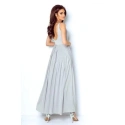 Długa damska suknia balowa, góra ozdobiona cekinami i koralikami. Zamek błyskawiczny z boku. Tył suk