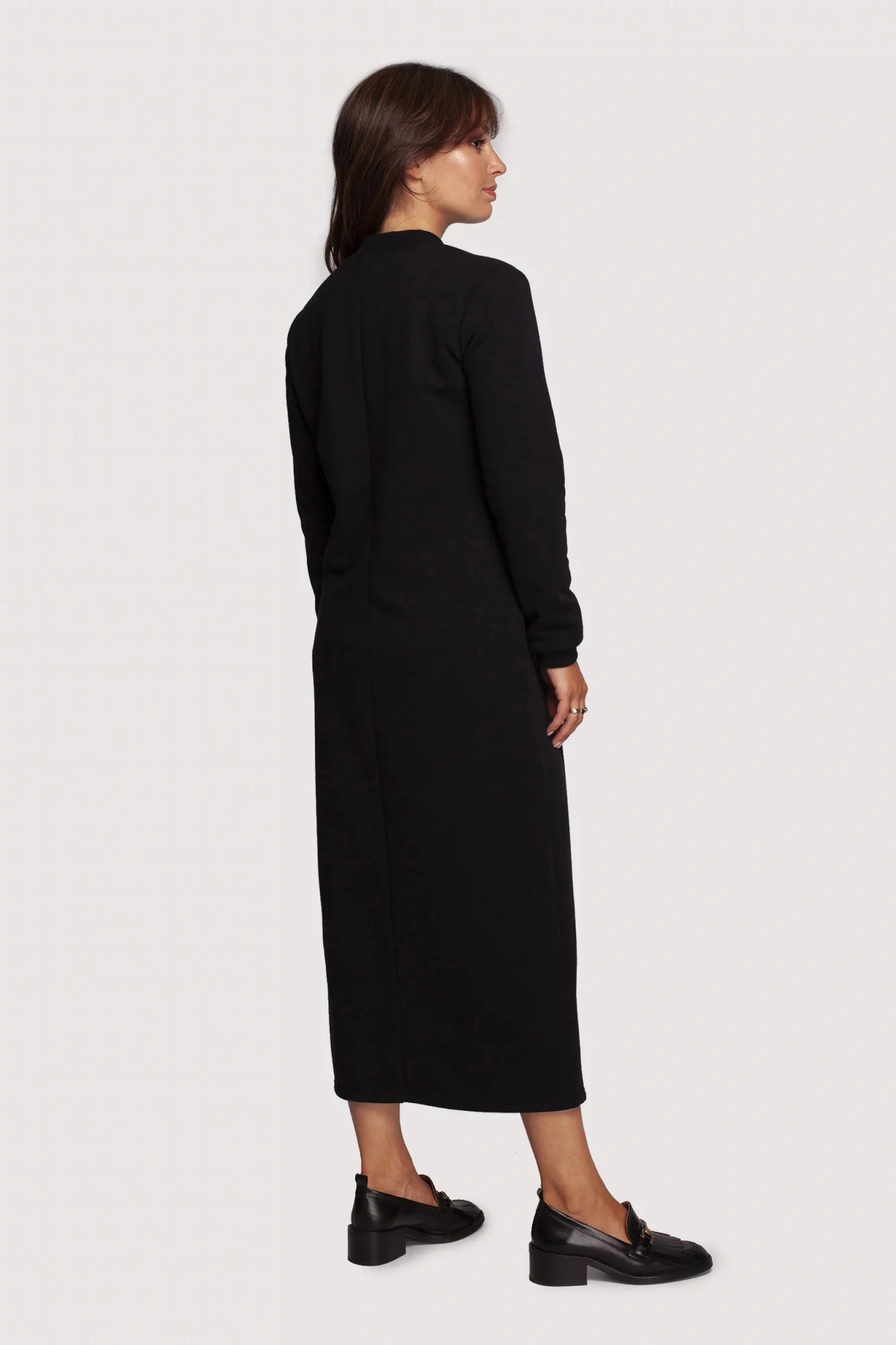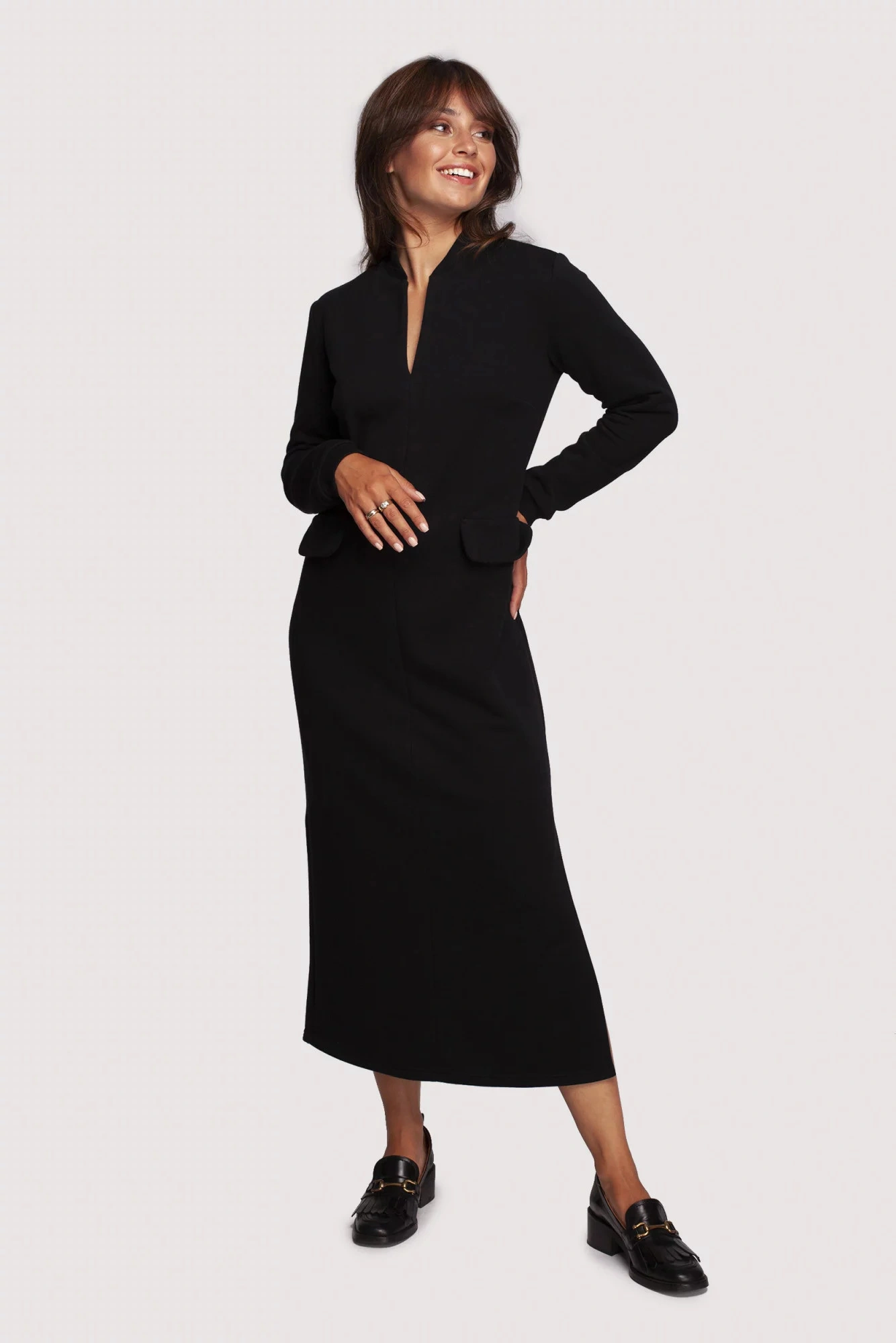 Sukienka maxi z maksymalnymi korzyściami. Jest wygodna dzięki bawełnianej dzianinie i regularnemu krojowi z wysokim rozcięciem z przodu. Subtelne detale, takie jak prążkowana stójka, subtelny dekolt w kształcie litery V i kieszenie z klapkami po bokach, dodają odrobiny szyku.