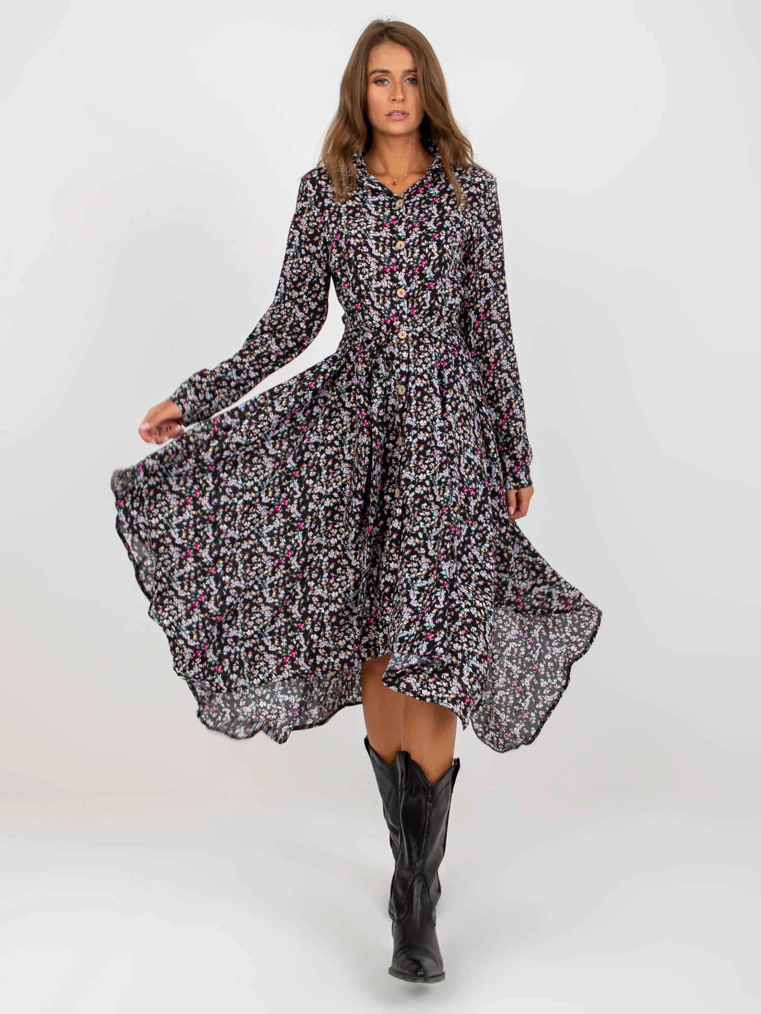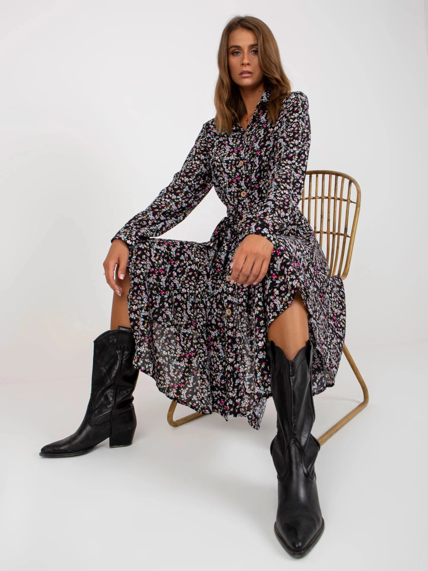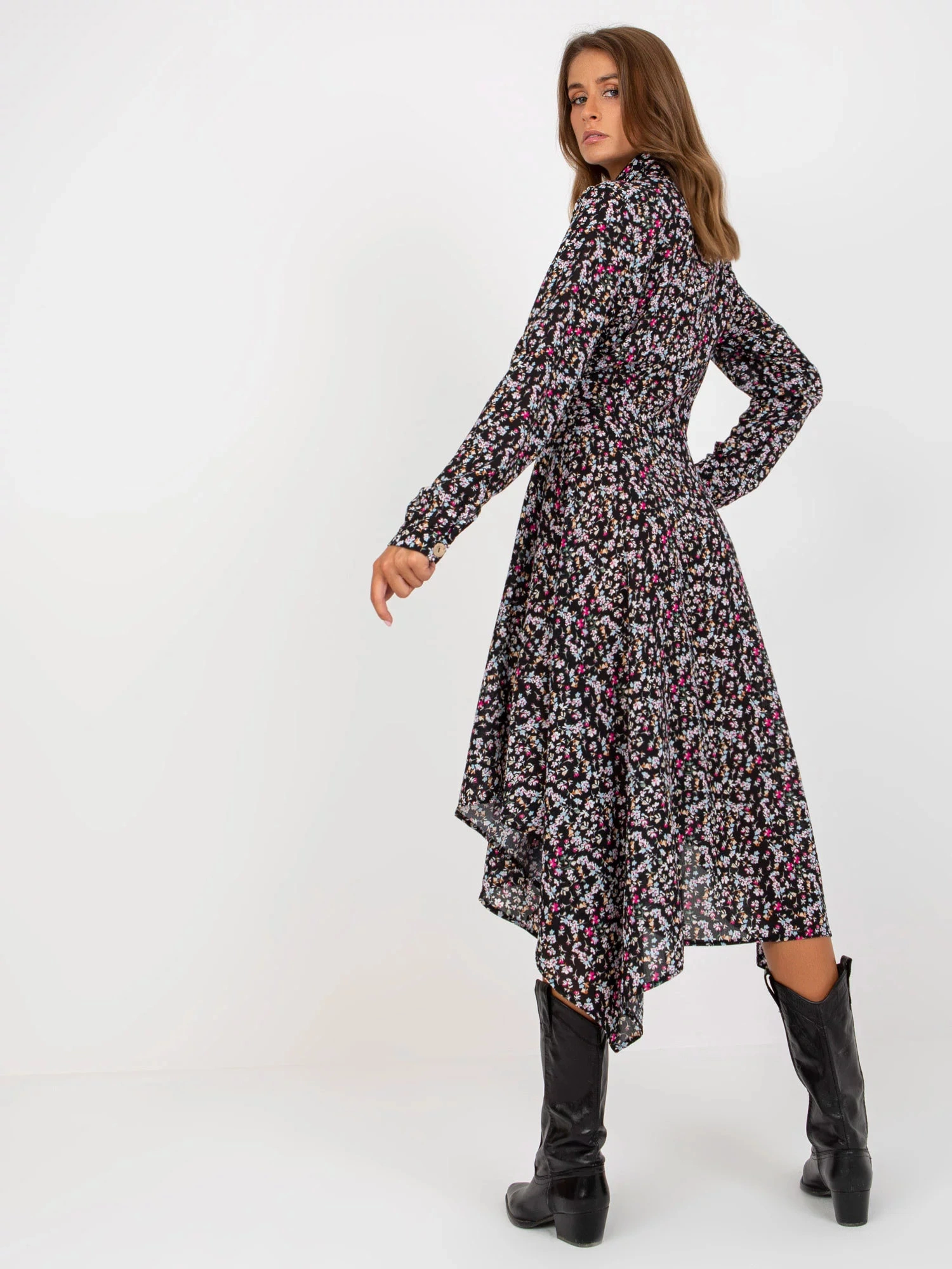 Wymiary sukienki w rozmiarze S/M mierzone na płasko: szerokość pod pachami - 50 cm, długość całkowita - 117 cm, długość rękawa - 63 cm.