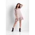 Elegancka sukienka o trapezowym kroju wykończona falbaną bez podszewki. Dekolt można zawiązać na kokardkę. Sukienka ma wiązany pasek w talii, który pozwala nosić ją na różne sposoby. Trapezowy krój sukienki doskonale maskuje niedoskonałości figury, wystający brzuszek czy szerokie biodra. Idealny wybór do noszenia na co dzień z płaskimi butami, a także na wieczorne wyjście z przyjaciółmi lub kolację w towarzystwie szpilek lub butów. Sukienka została uszyta w Polsce w naszej pracowni krawieckiej, co gwarantuje wysoką jakość oferowanego produktu.