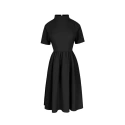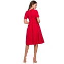 Sukienka z obcisłą górą, reglanowymi rękawami i ciekawym wywiniętym kołnierzem. Dzięki podkreślonej talii i rozkloszowanemu dołowi sukienka jest bardzo kobieca i reaguje na każdy ruch. Sukienka zapinana jest na ukryty zamek błyskawiczny.