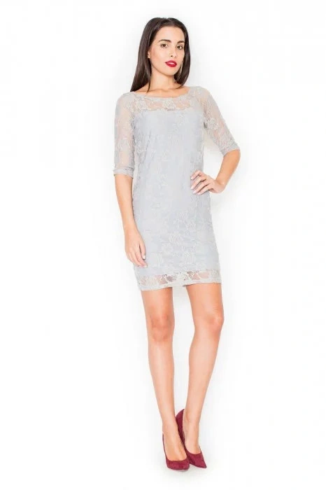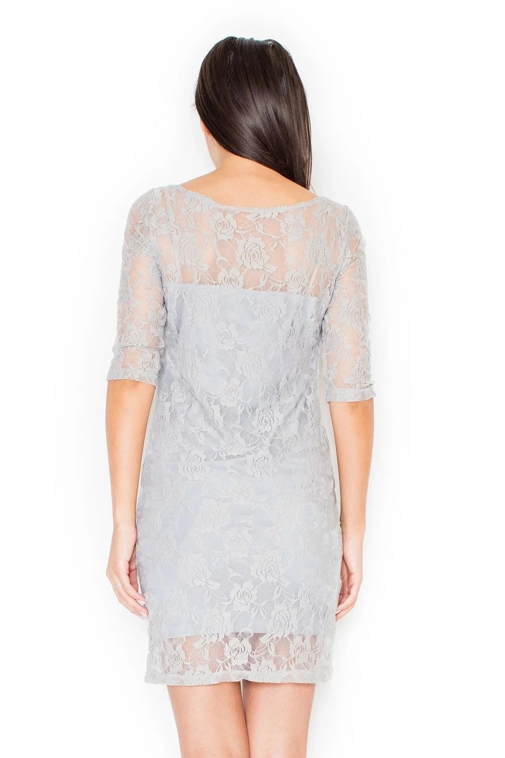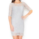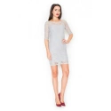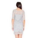 Elegancka sukienka damska M076 FIGL z odkrytymi plecami. Górna część sukienki jest ozdobiona koronką