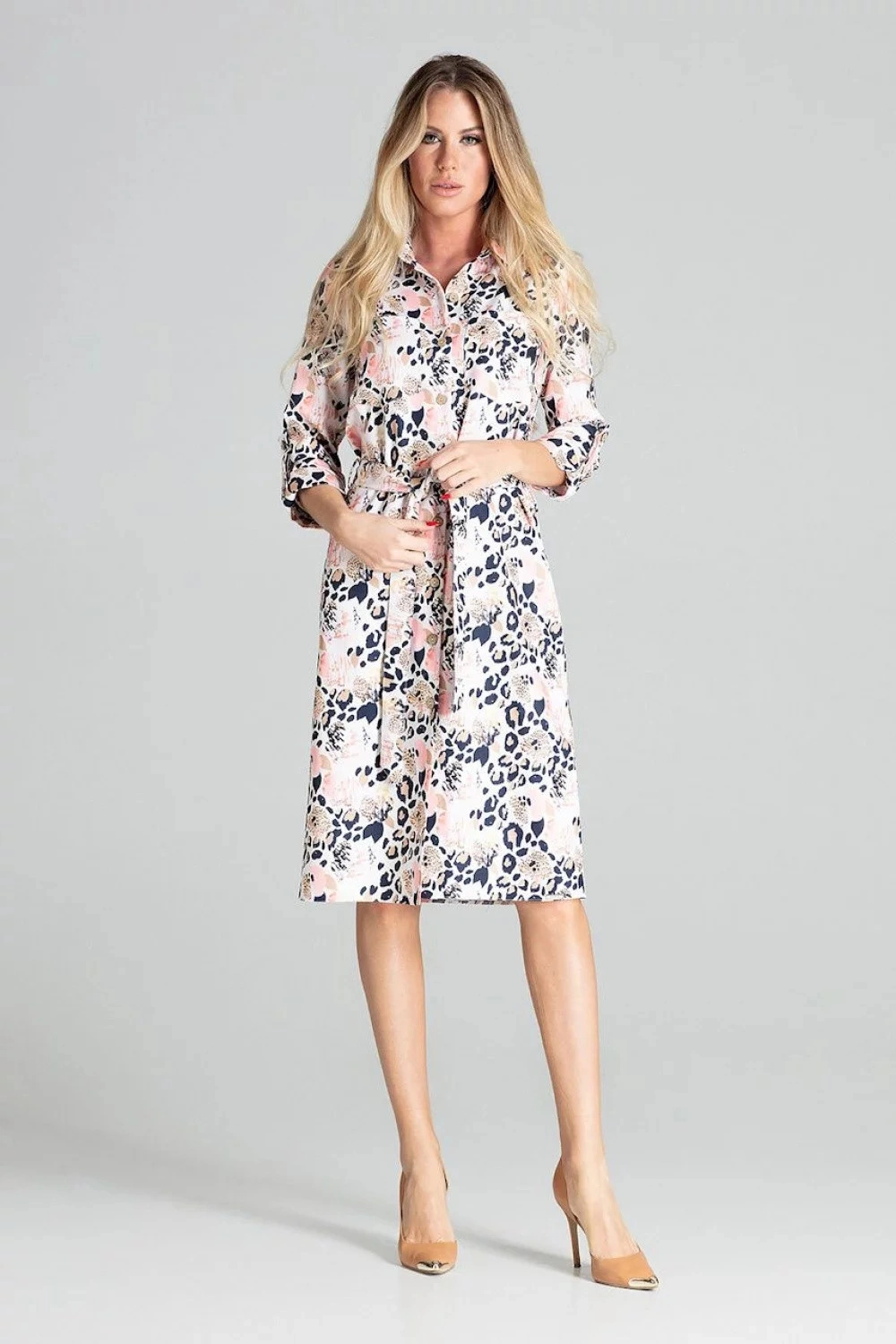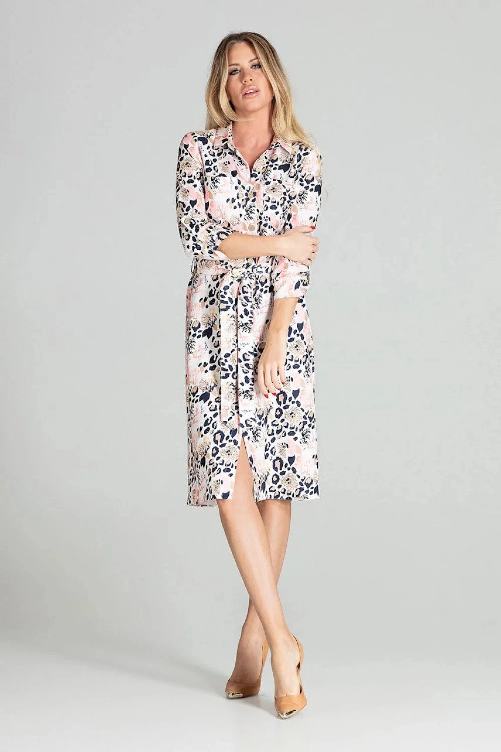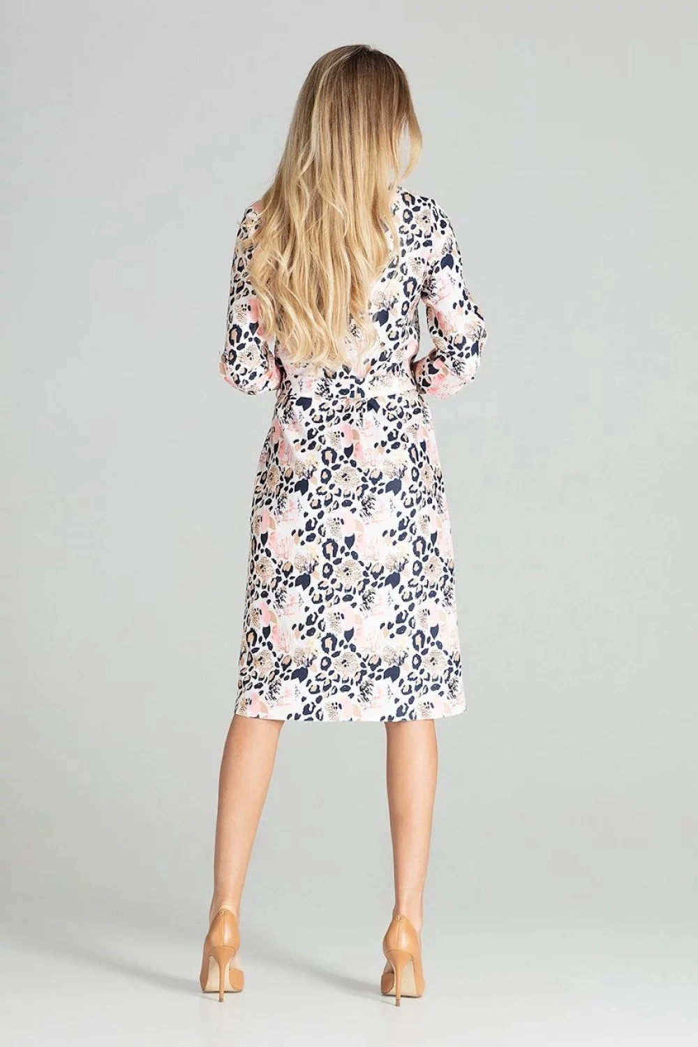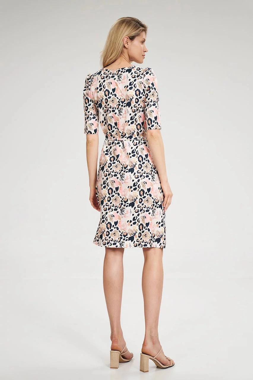 Kopertowa sukienka midi z nadrukiem w panterkę. Dekolt V, krótkie rękawy z falbankami, wiązanie w talii, ozdobne guziki z przodu.