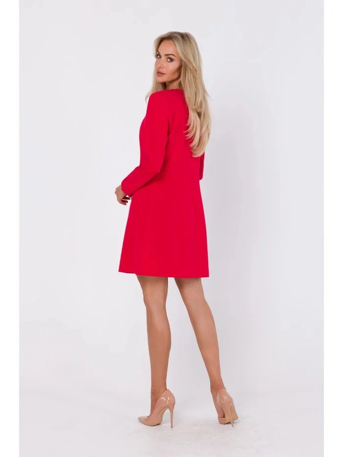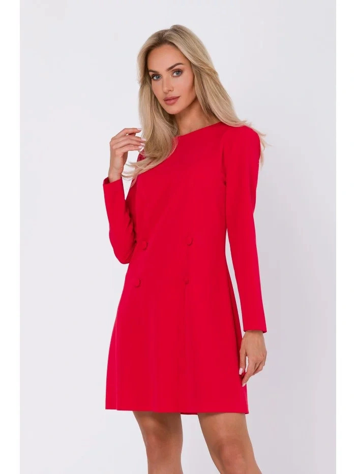 INFORMACJE O PRODUKCIE: Tkana sukienka materiałowa z ozdobnymi guzikami z przodu okrągły dekolt długie rękawy długość powyżej kolan ukryty zamek błyskawiczny z tyłu bez podszewki Nasza modelka ma 171 cm wzrostu i nosi rozmiar S Zaprojektowano i wykonano w Polsce
