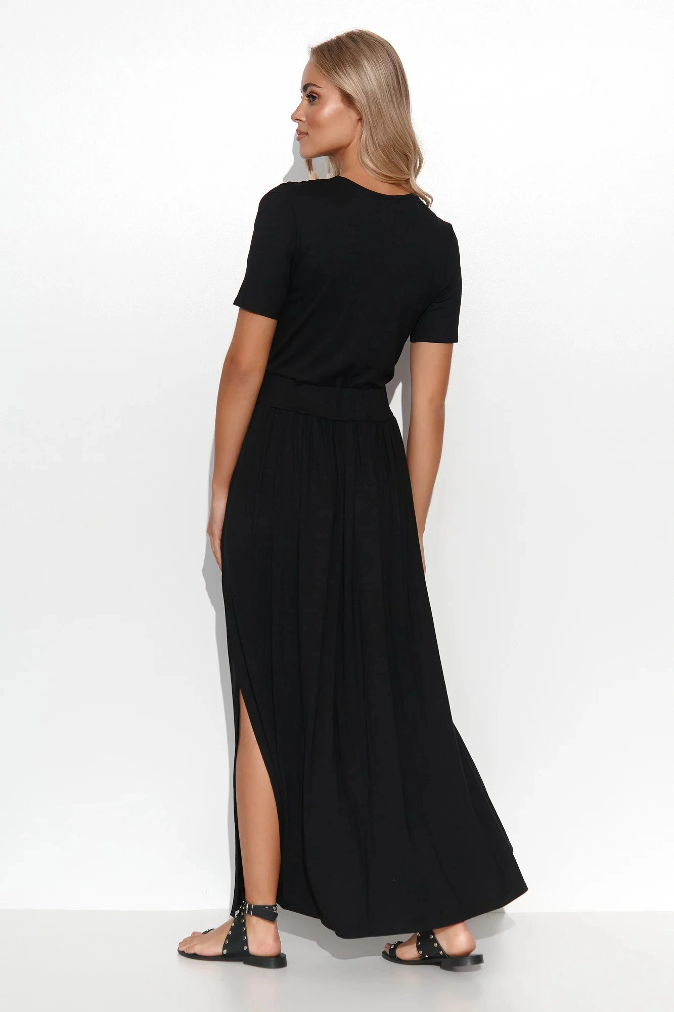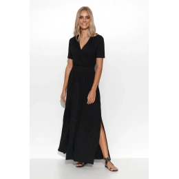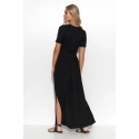 Długa sukienka z głębokim dekoltem. Krótkie rękawy, masywna guma wszyta w pasie.