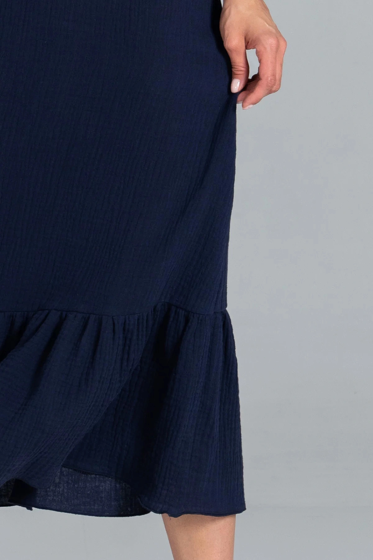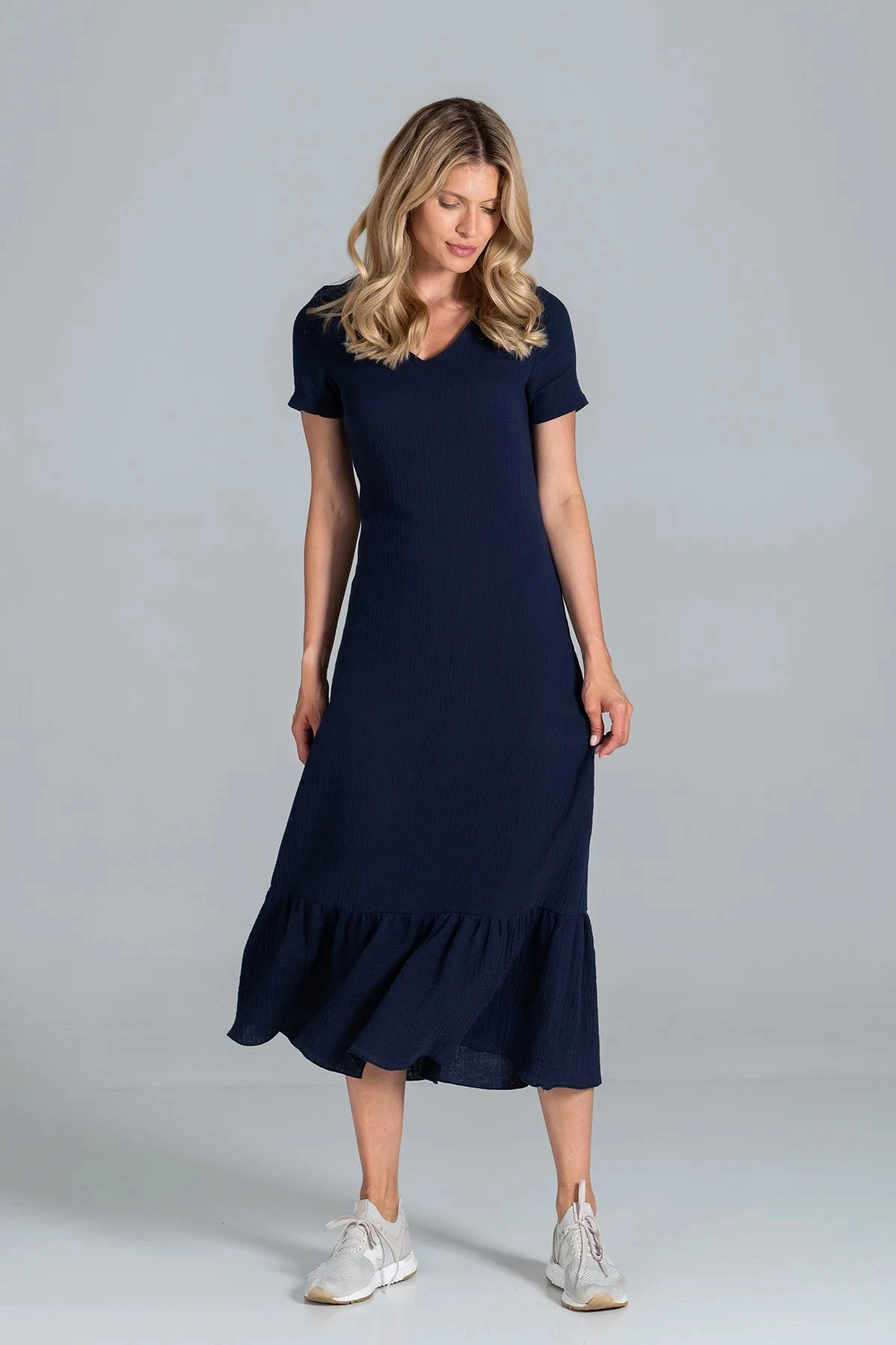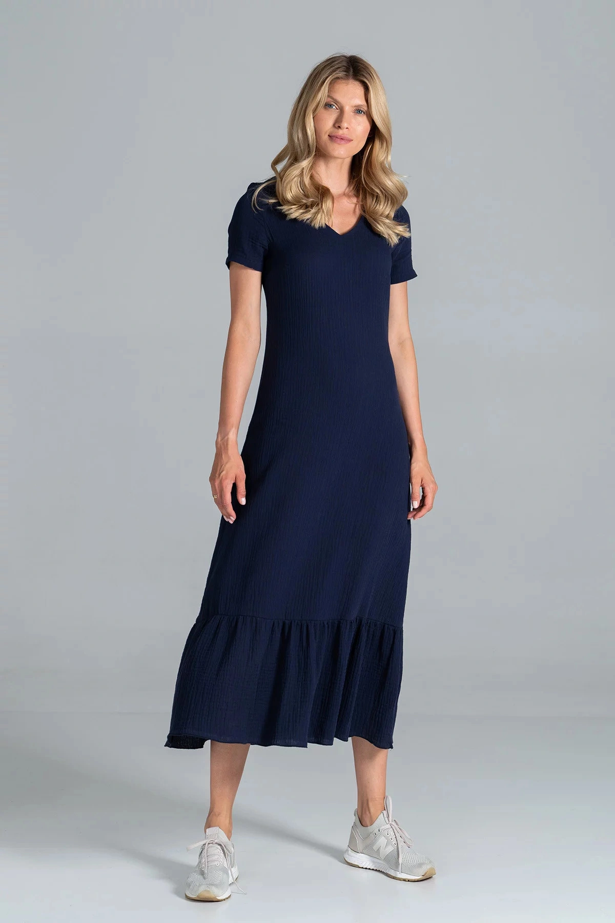 Długa sukienka damska z falbaną na dole. Skład materiału: 100% bawełna