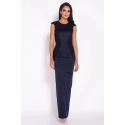 Damska długa luksusowa sukienka bez rękawów z kunsztownie uszytą górą. Okrągły dekolt. Zapięcie na z