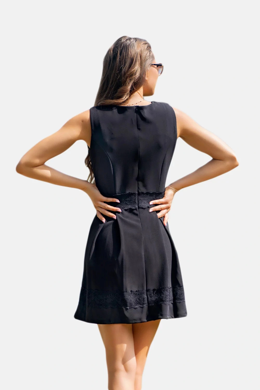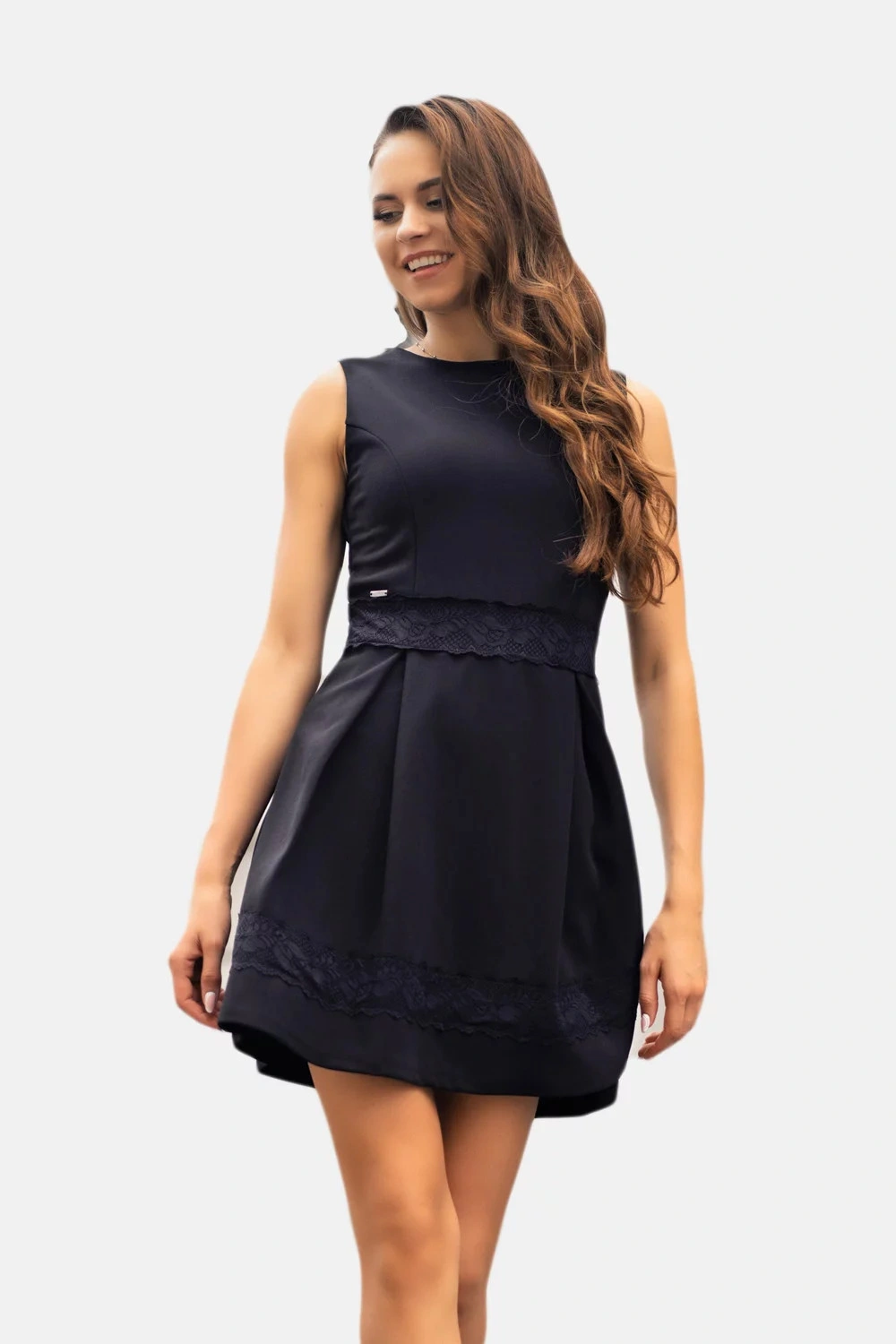 Damska sukienka bez rękawów z koronką wszytą w talii i koronką na dole spódnicy. Spódnica jest rozkloszowana. Sukienka jest zapinana z tyłu na ukryty zamek błyskawiczny.