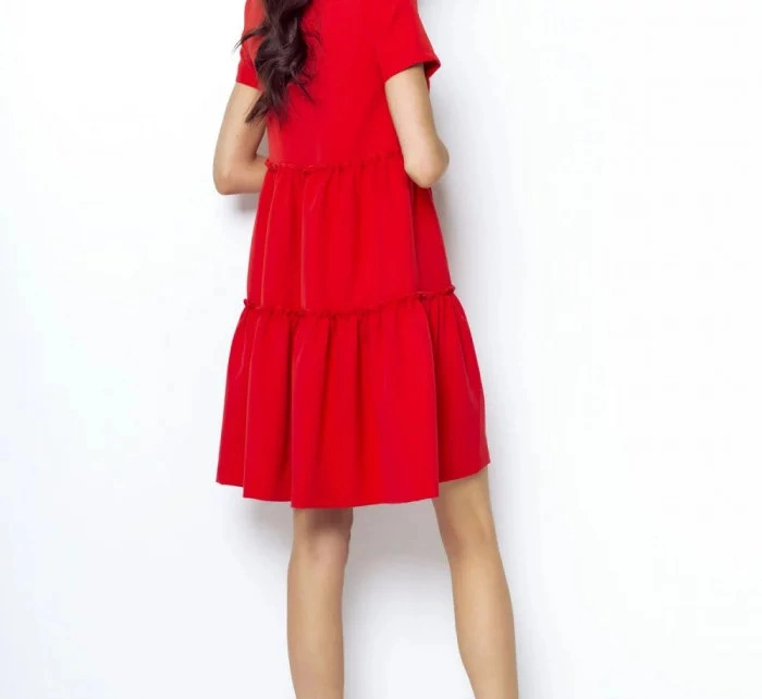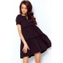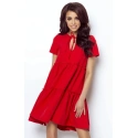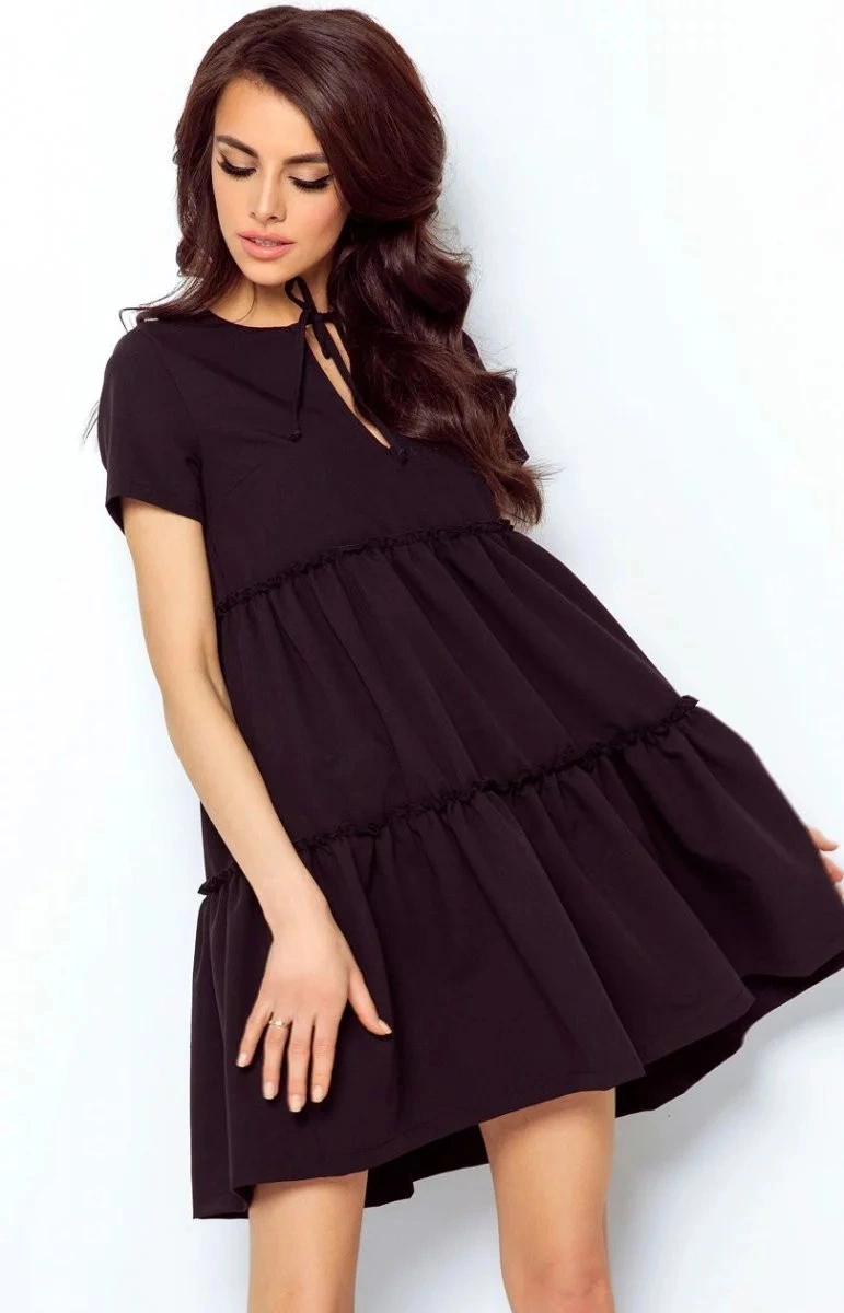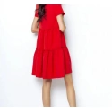Elegancka sukienka o rozkloszowanym kroju. Górna część sukienki jest dopasowana, z dekoltem w kształcie łezki, wiązanym na szyi kokardą. Sukienka ma szerokie falbany, które nadają jej dziewczęcego uroku. Model bez podszewki. Idealny na różne okazje, pasuje zarówno do butów na obcasie, jak i czółenek lub butów sportowych. Sukienki wyprodukowane w Polsce, co gwarantuje wysoką jakość oferowanego produktu.