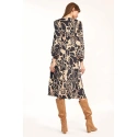 Wzorzysta sukienka midi to element, który każdy powinien mieć w swojej szafie! Model ten jest idealny do pracy i codziennego użytku. Materiał znacząco dopasowuje się do sylwetki. Sukienka podkreśla talię. Dekolt w kształcie litery V wydłuża szyję. Długie rękawy zakończone bufką dodają oryginalnego wyglądu. Z tym wzorem nie musisz martwić się o akcesoria, jest on niesamowitą dekoracją samą w sobie.