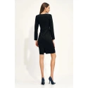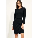 Dopasowana sukienka z długimi rękawami kończącymi się na wysokości kolan, z półokrągłym dekoltem i rozcięciem z tyłu spódnicy. Zapięcie na zamek błyskawiczny. Posiada zdobienie z przodu w talii.