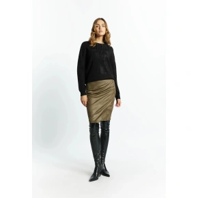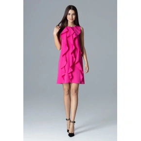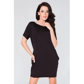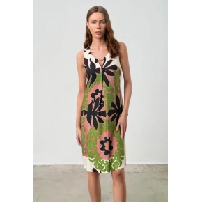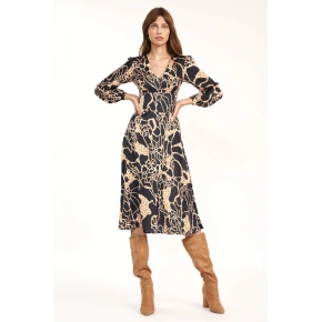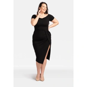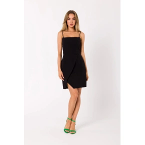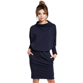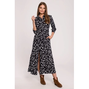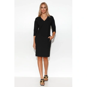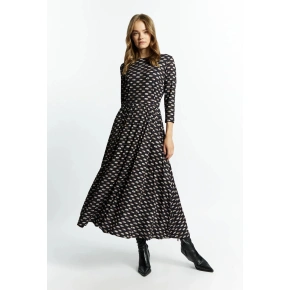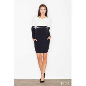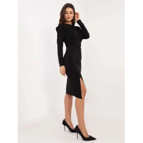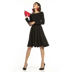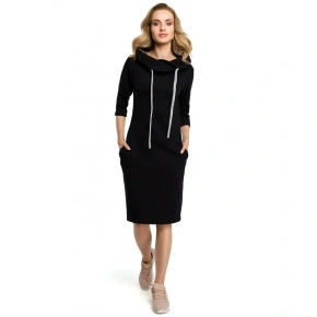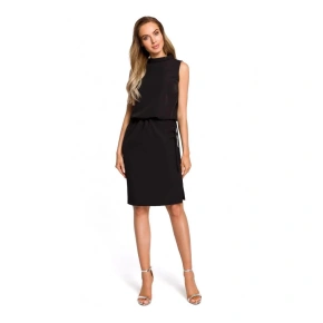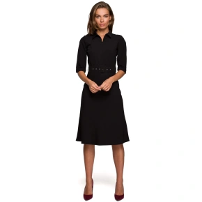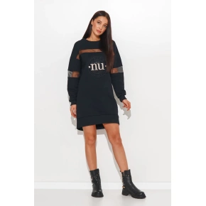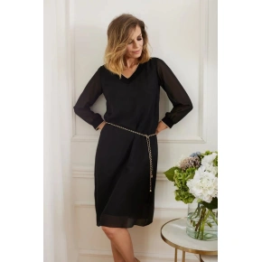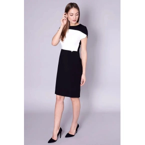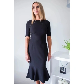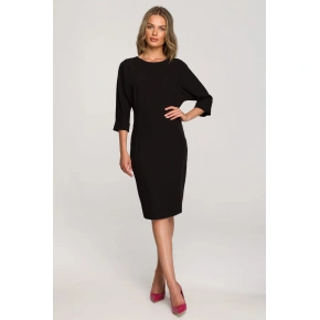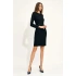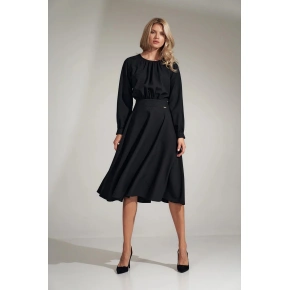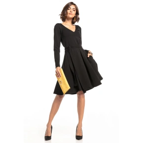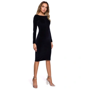 Dopasowana sukienka z długimi rękawami kończącymi się na wysokości kolan, z półokrągłym dekoltem i rozcięciem z tyłu spódnicy. Zapięcie na zamek błyskawiczny. Posiada zdobienie z przodu w talii.