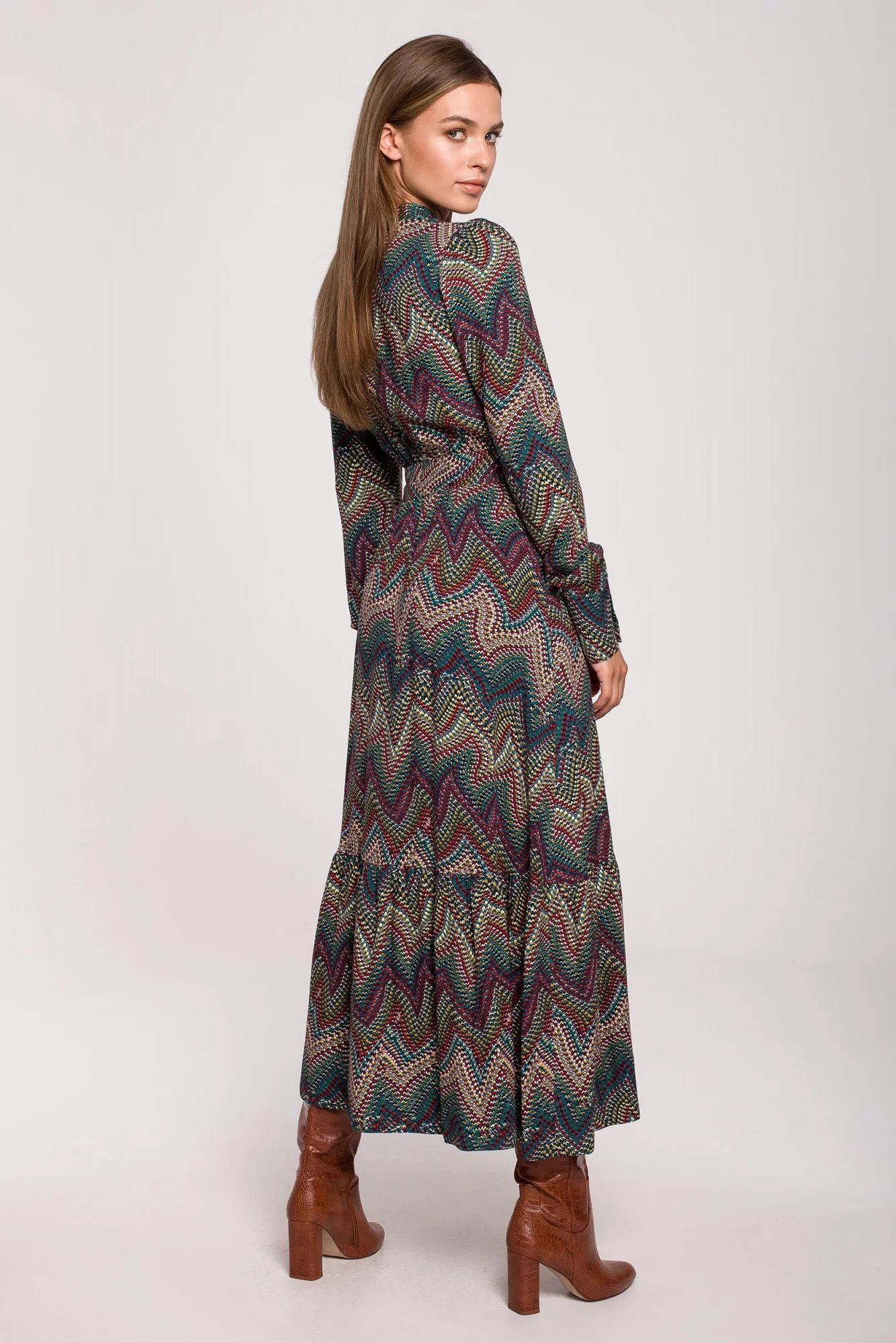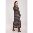 Maksymalny komfort, maksymalna elegancja w postaci sukienki maxi z azteckim nadrukiem, marszczonym dołem i stójką. Najlepiej komponują się z wysokimi butami.Skład materiału: 100% wiskoza