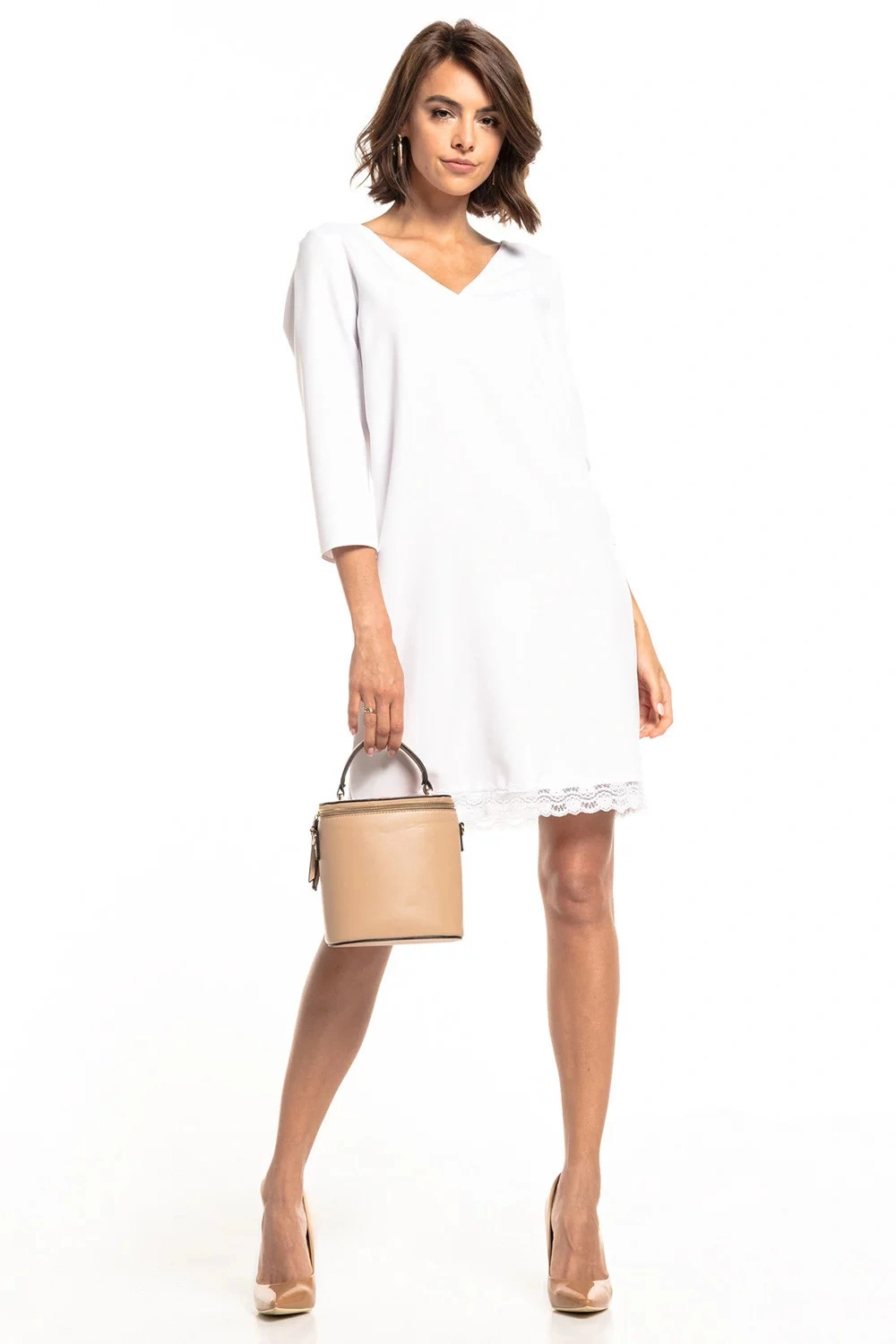 Prosta sukienka z dekoltem w kształcie serca, wykończona na dole koronką.