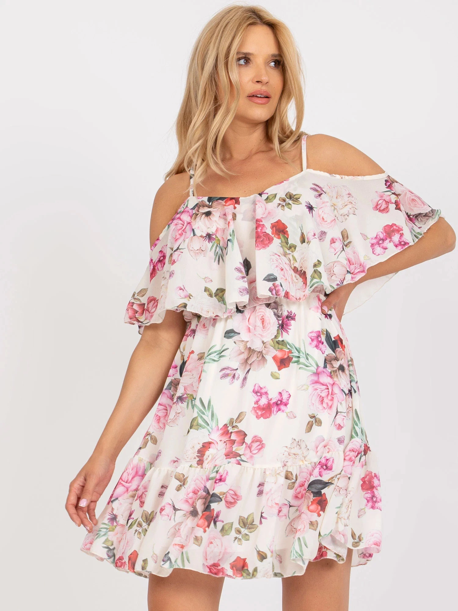 Modelka ma na sobie jeden rozmiar. Wymiary modelki: wzrost 175 cm, biust 84 cm, talia 65 cm, biodra 92 cm.