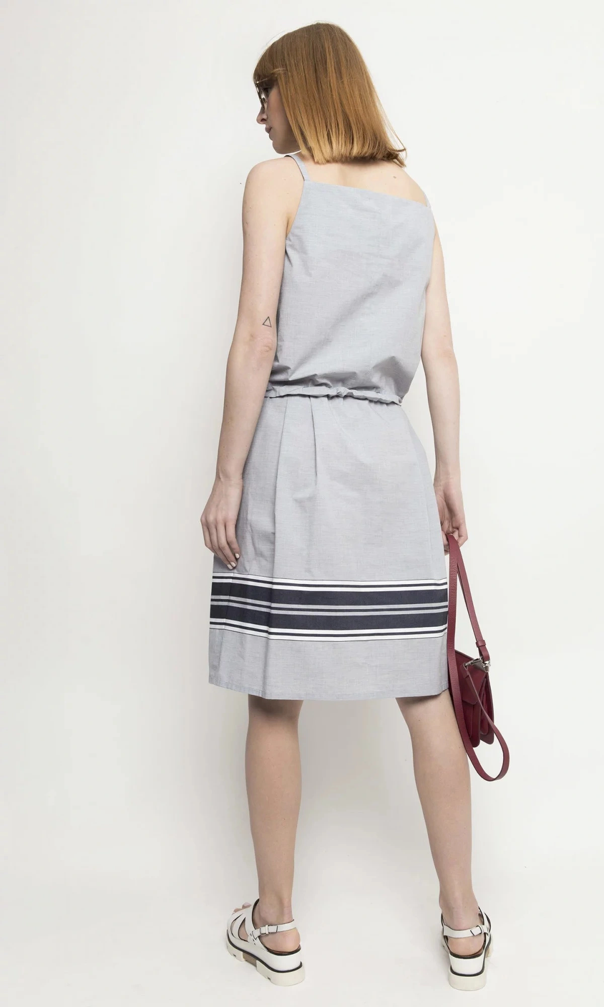Jasnoszara sukienka z ciemnoniebieskimi i białymi elementami dekoracyjnymi.100% bawełnaInstrukcja pielęgnacji:Pranie ręczne lub profesjonalne czyszczenie chemiczneKolekcja:Wiosna/LatoKolor:SzaryPłeć:Kobieta