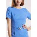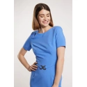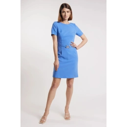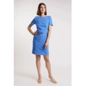 Damska sukienka mini w eleganckim stylu. Sukienka z krótkim rękawem, półokrągłym dekoltem i ozdobnym paskiem w talii. Sukienka zapinana jest z tyłu na kryty zamek błyskawiczny. Model ten z pewnością przyda się podczas specjalnych okazji. Modelka na zdjęciu ma 177 cm wzrostu i nosi rozmiar 36.