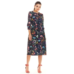 Prosta, ale elegancka sukienka z rękawami 3/4, elastyczną talią, delikatną falbanką przy dekolcie i wiązaniem. Idealny na co dzień i nie tylko.