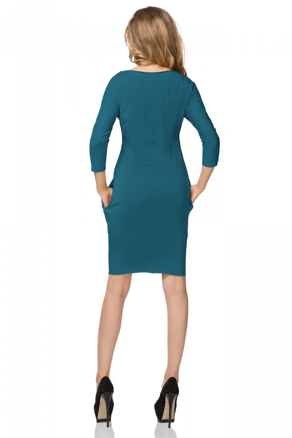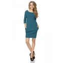 Sportowa sukienka z dekoltem w łódkę. Kieszeń w szwie bocznym. Tylne cięcie. Dół, rękawy i dekolt pozostały nieobrobione.