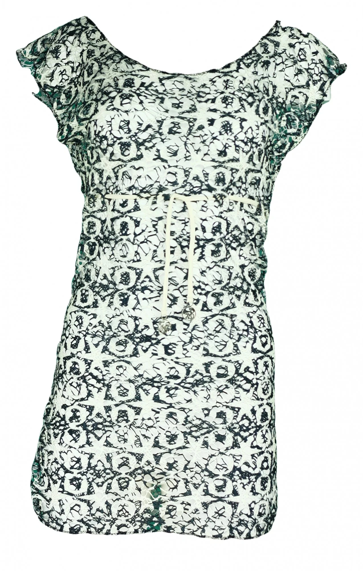 - długość sukienki wynosi 90 cm - Dekolt w kształcie litery V ozdobiony płatkami - ozdobny sznurek