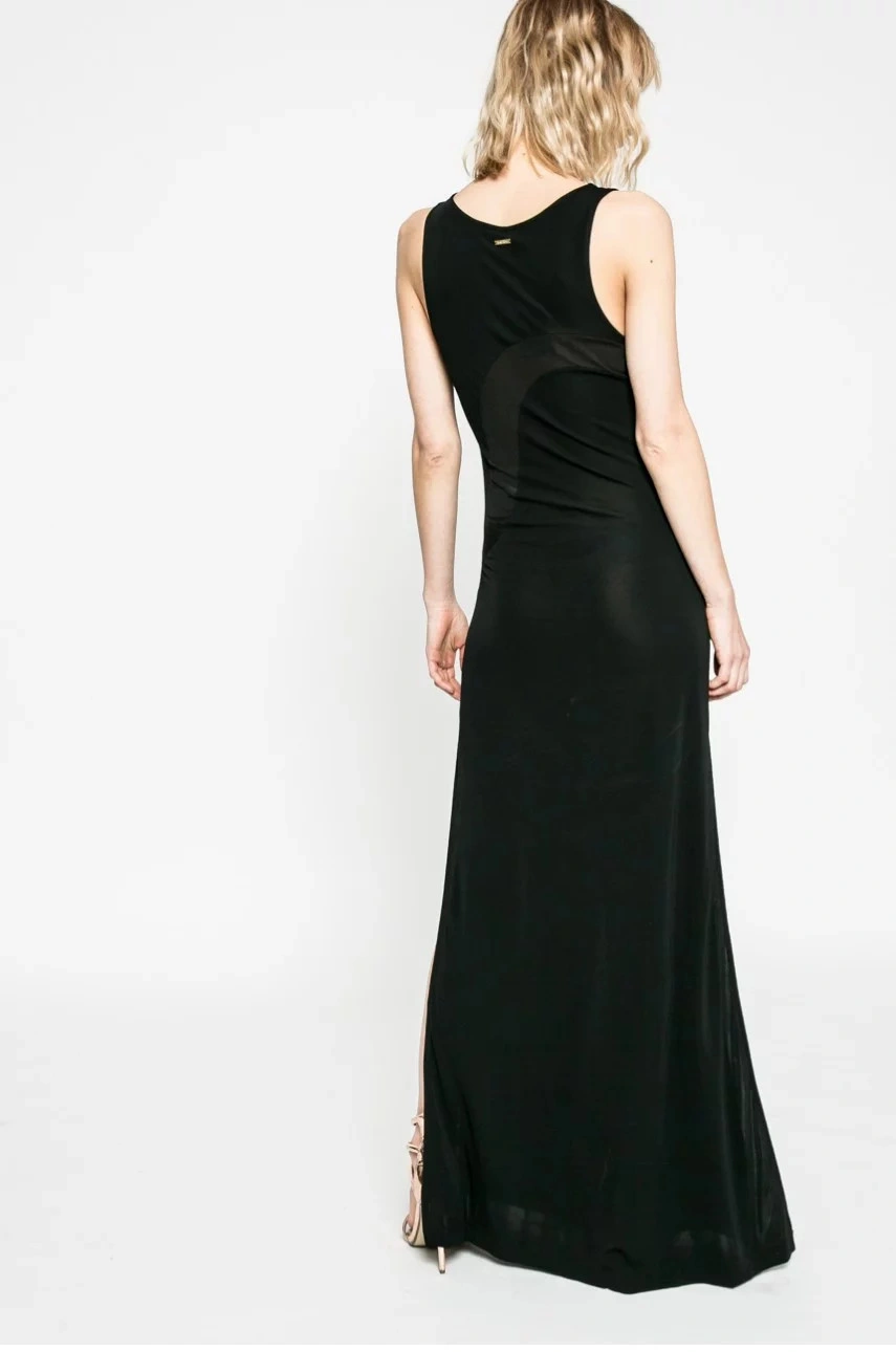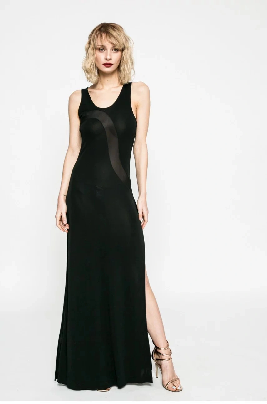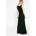 Czarna długa zmysłowa sukienka bez rękawów, wiązana na ramionach, z dużym niskim dekoltem. Górna czę