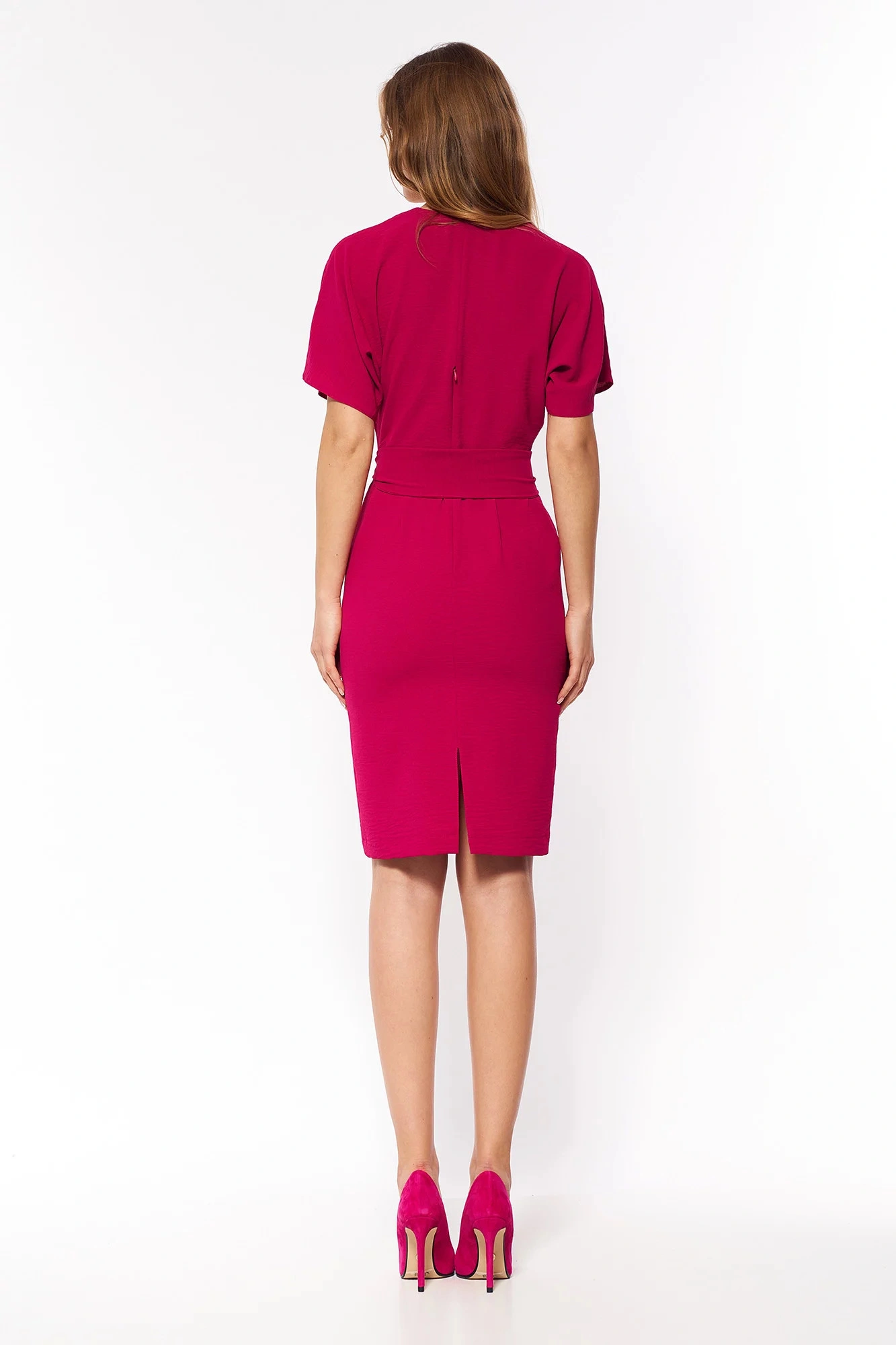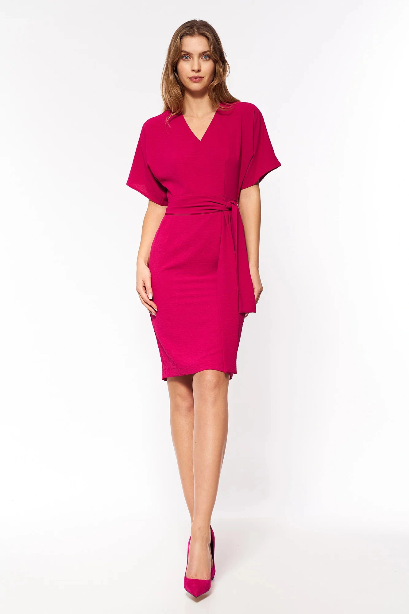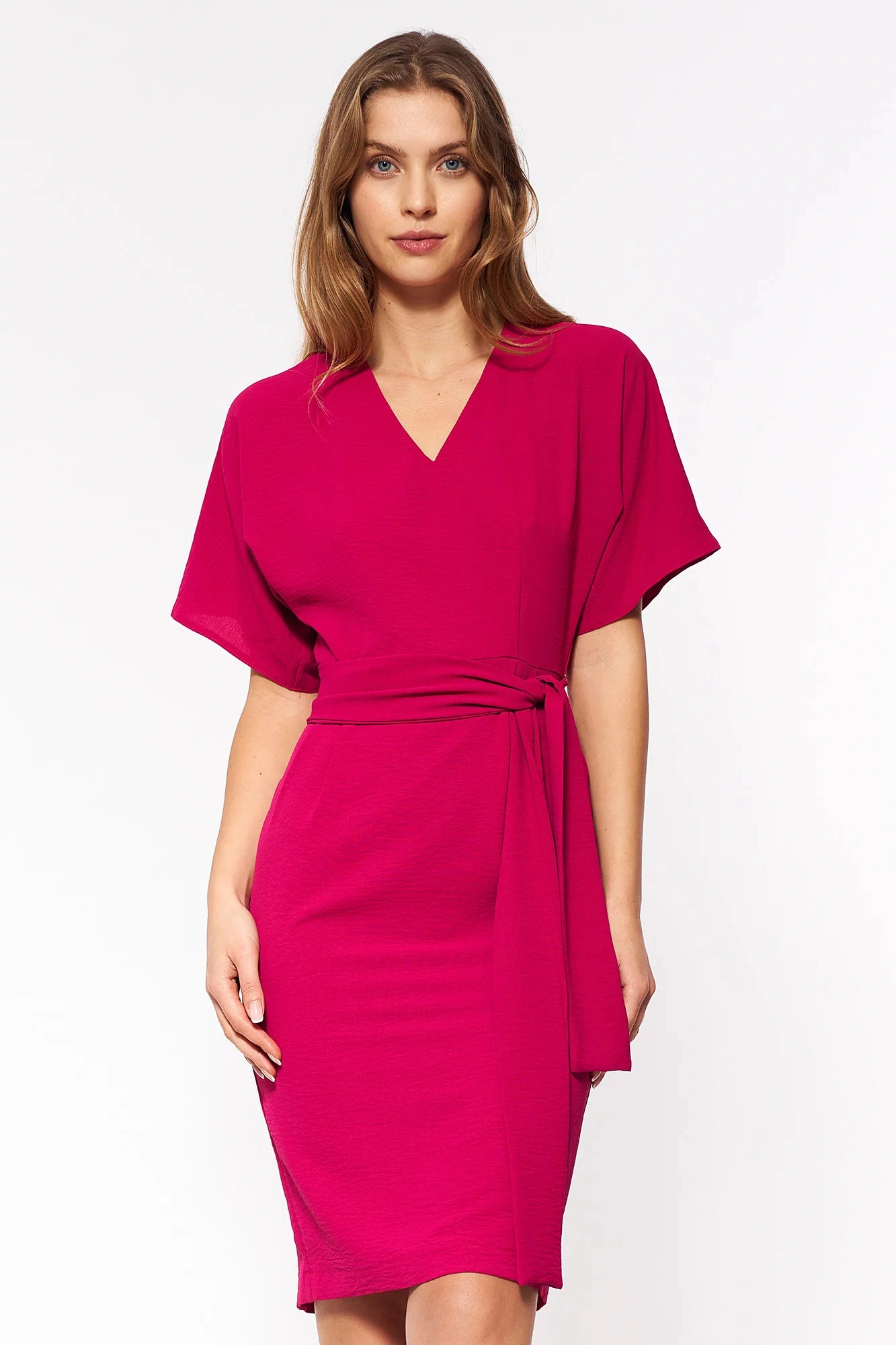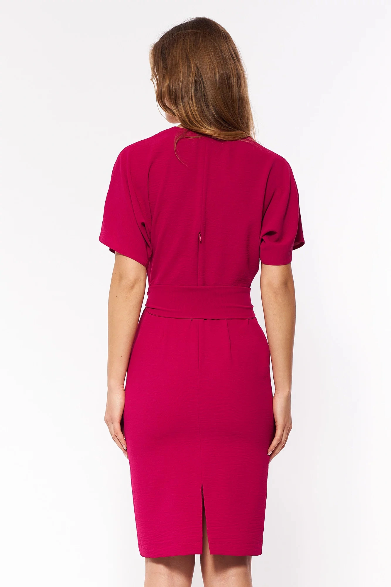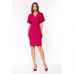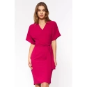 Luźna sukienka kończąca się nad kolanem. Kimonowy top z dekoltem w szpic i plisowana ołówkowa spódnica z paskiem. Szerokie rękawy do łokcia. Zapięcie na zamek błyskawiczny i otwór wentylacyjny z tyłu. Tkanina szydełkowa, bez podszewki.
