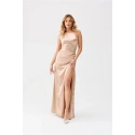 Sukienka Inez została wykonana z miękkiej, lejącej satynowej tkaniny, która nadaje jej szyku i elegancji. Sukienka posiada ciekawy dekolt odsłaniający jedno ramię, dzięki zastosowaniu szerokiego paska z marszczeniami. Idealne dopasowanie w talii oraz długa, lejąca spódnica z rozcięciem na nogę doskonale podkreślają atuty sylwetki. Sukienka Inez gwarantuje dostojny i elegancki wygląd dzięki klasycznemu krojowi wzbogaconemu o oryginalny dekolt na jedno ramię. Elegancki krój sukienki, podkreślony odsłoniętym ramieniem i seksownym rozcięciem na nogę, przyciąga uwagę i podkreśla sylwetkę. Sukienka jest idealna na specjalne okazje, takie jak wesela, przyjęcia, bale i imprezy firmowe.