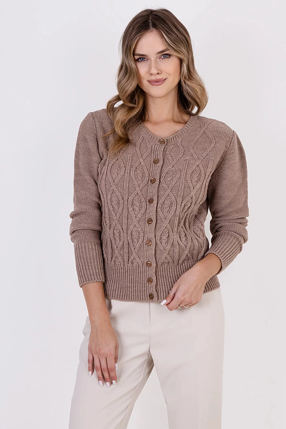 Ten elegancki kardigan o długości do bioder to idealny wybór zarówno na co dzień, jak i na bardziej formalne okazje. Sweter ma okrągły dekolt, który nadaje mu klasycznego uroku. Prążkowane mankiety zapewniają również idealne dopasowanie. Unikalne ozdobne wiązania nadają swetrowi wyjątkowego charakteru.