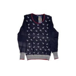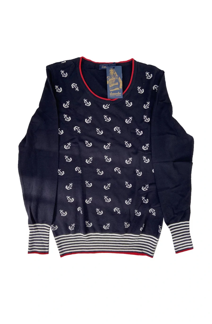 Sweter damski 432H- 987E - Ilmodo- to elegancki sweter z morskim wzorem i kotwicami. Ma okrągły dekolt z czerwonym obszyciem, a rękawy są również wykończone niebiesko-białym paskiem, który znajduje się również w talii.