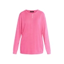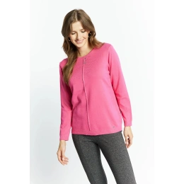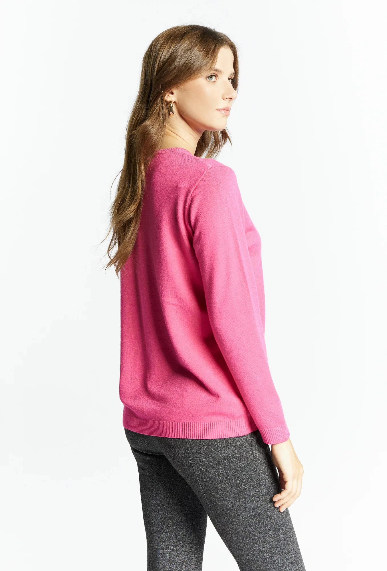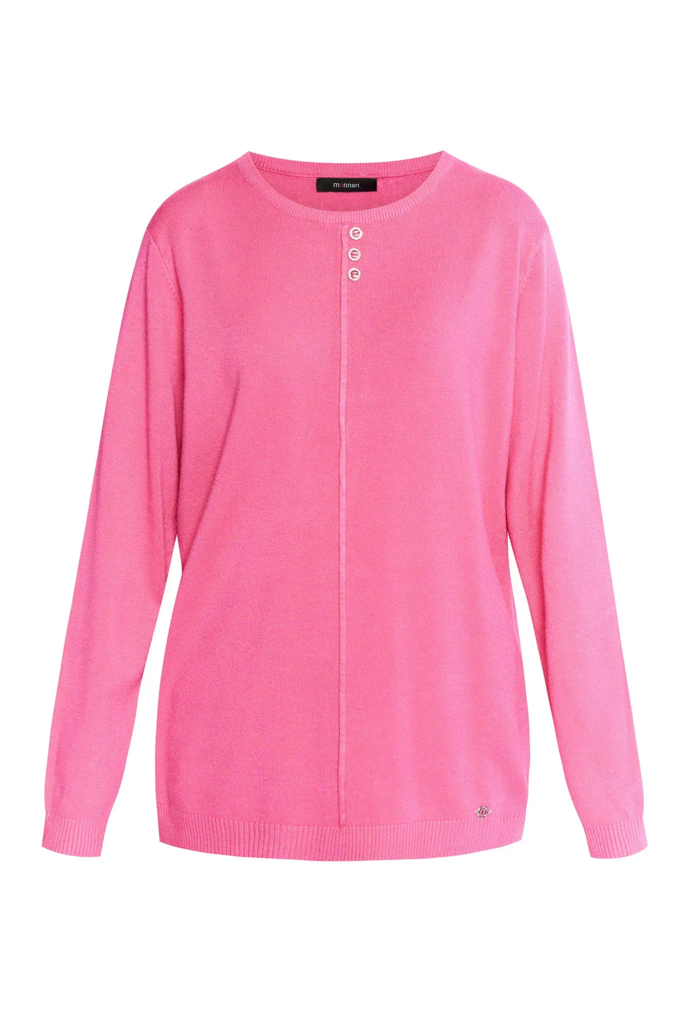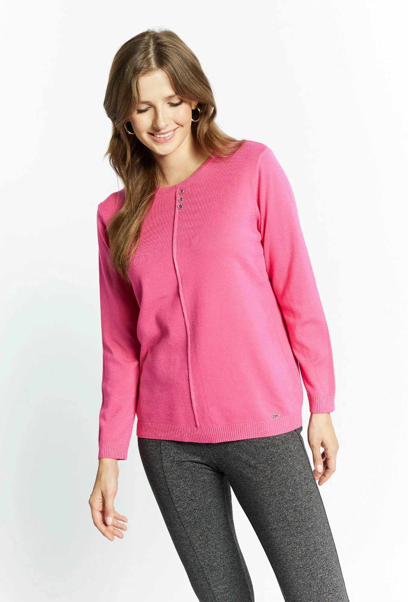 Damski sweter z wiskozy wykonany z przyjemnego w dotyku materiału. Sweter z długim rękawem i okrągłym dekoltem. Sweter ozdobiony jest trzema połyskującymi aplikacjami przy dekolcie. Dostępny w różnych kolorach, model ten jest świetnym dodatkiem do codziennego wyglądu. Modelka na zdjęciu ma 177 cm wzrostu i nosi rozmiar S/M.