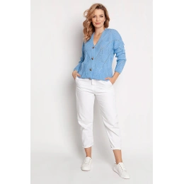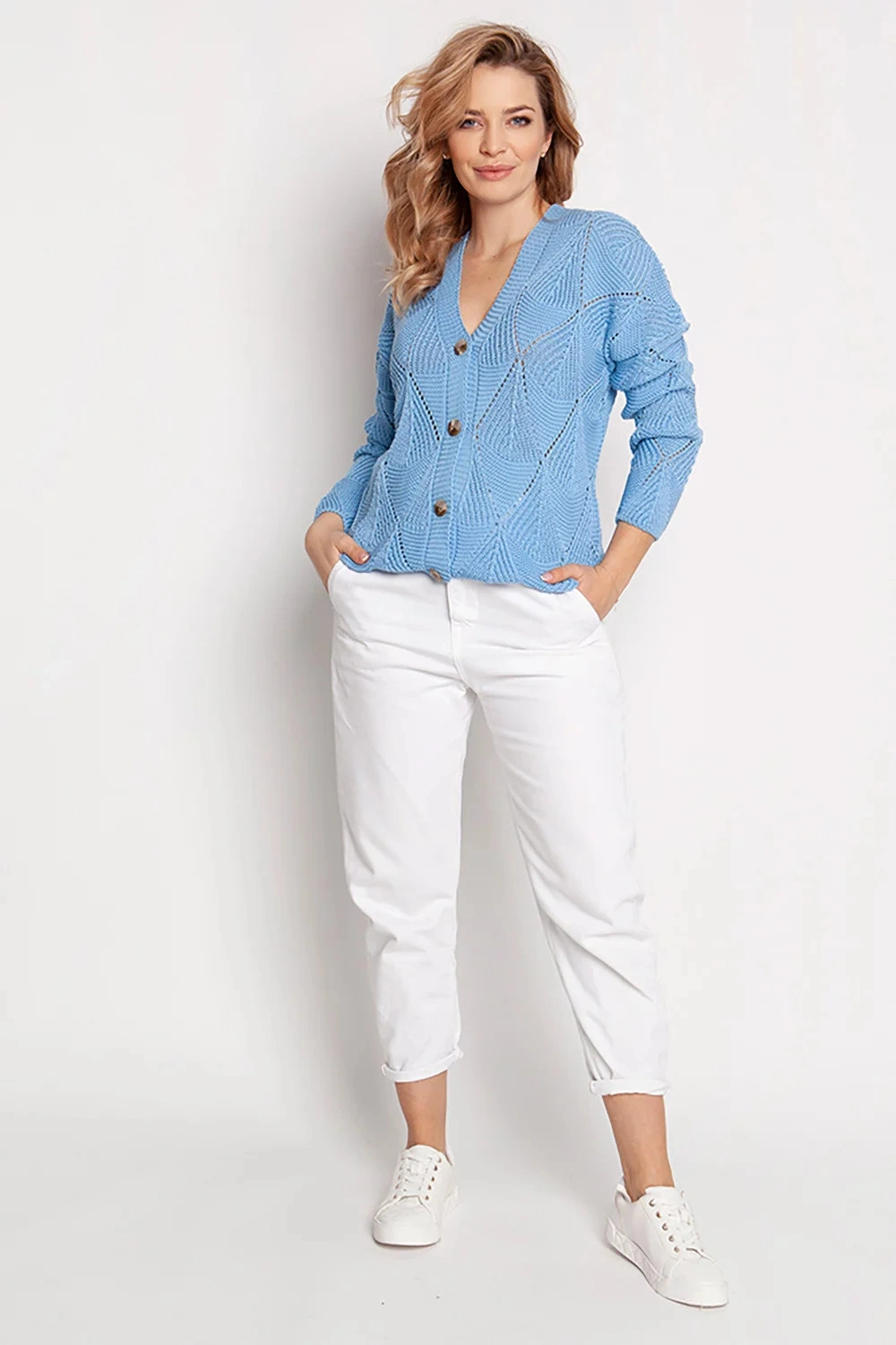 Obszerny kardigan z dekoltem w kształcie serca i dużymi guzikami. Luźny i swobodny, drobny ażurowy haft i wysokiej jakości przędza nadają mu elegancki charakter. Świetnie wygląda z wiosennymi sukienkami i spodniami.