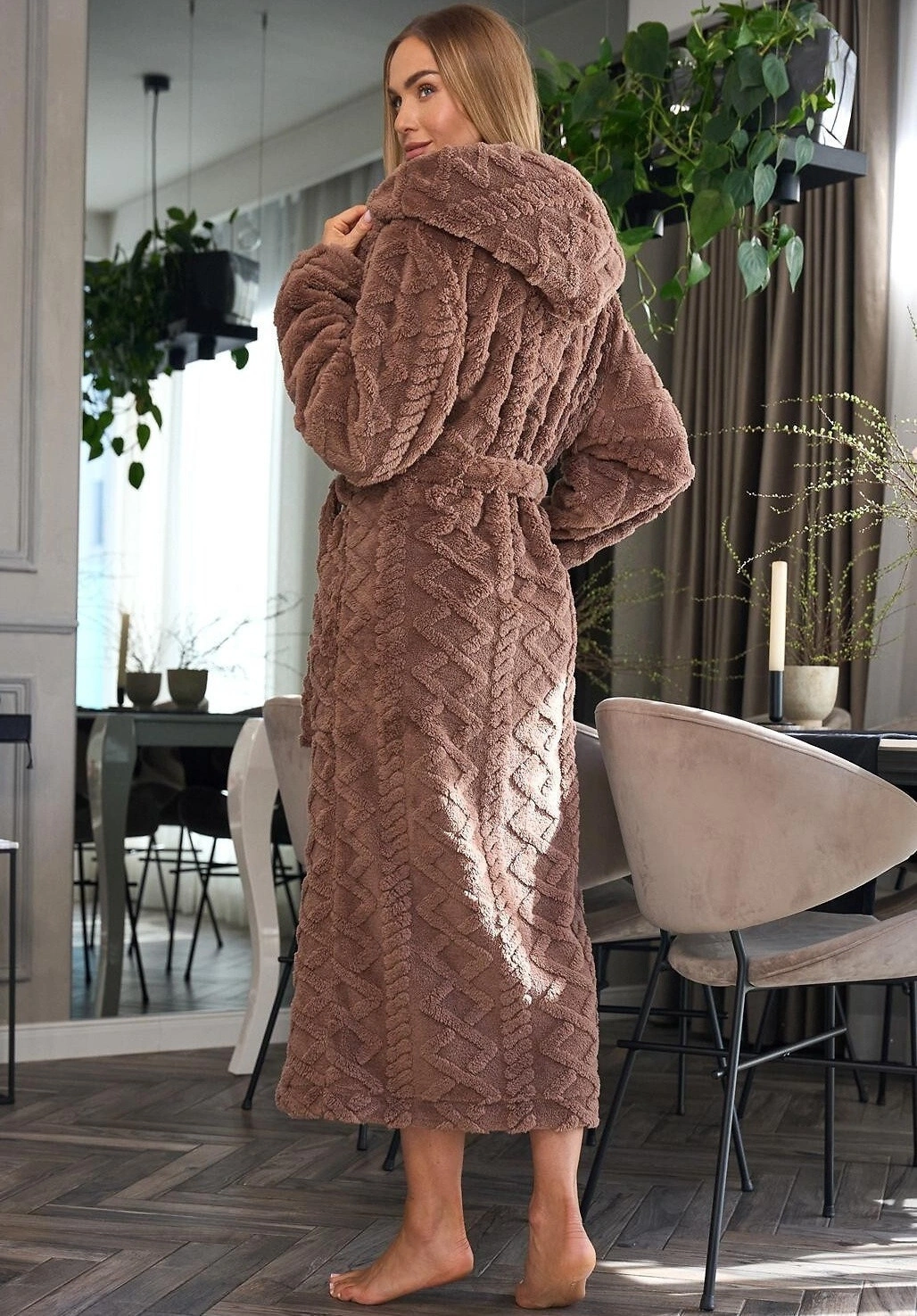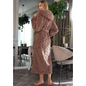 Szlafrok damski z haftowanym wzorem i kapturem marki L&L. Szlafrok ma długość poniżej kolana i kieszenie po bokach. Szlafrok można zawiązać w talii za pomocą paska. Szlafrok jest bardzo przyjemny w dotyku.