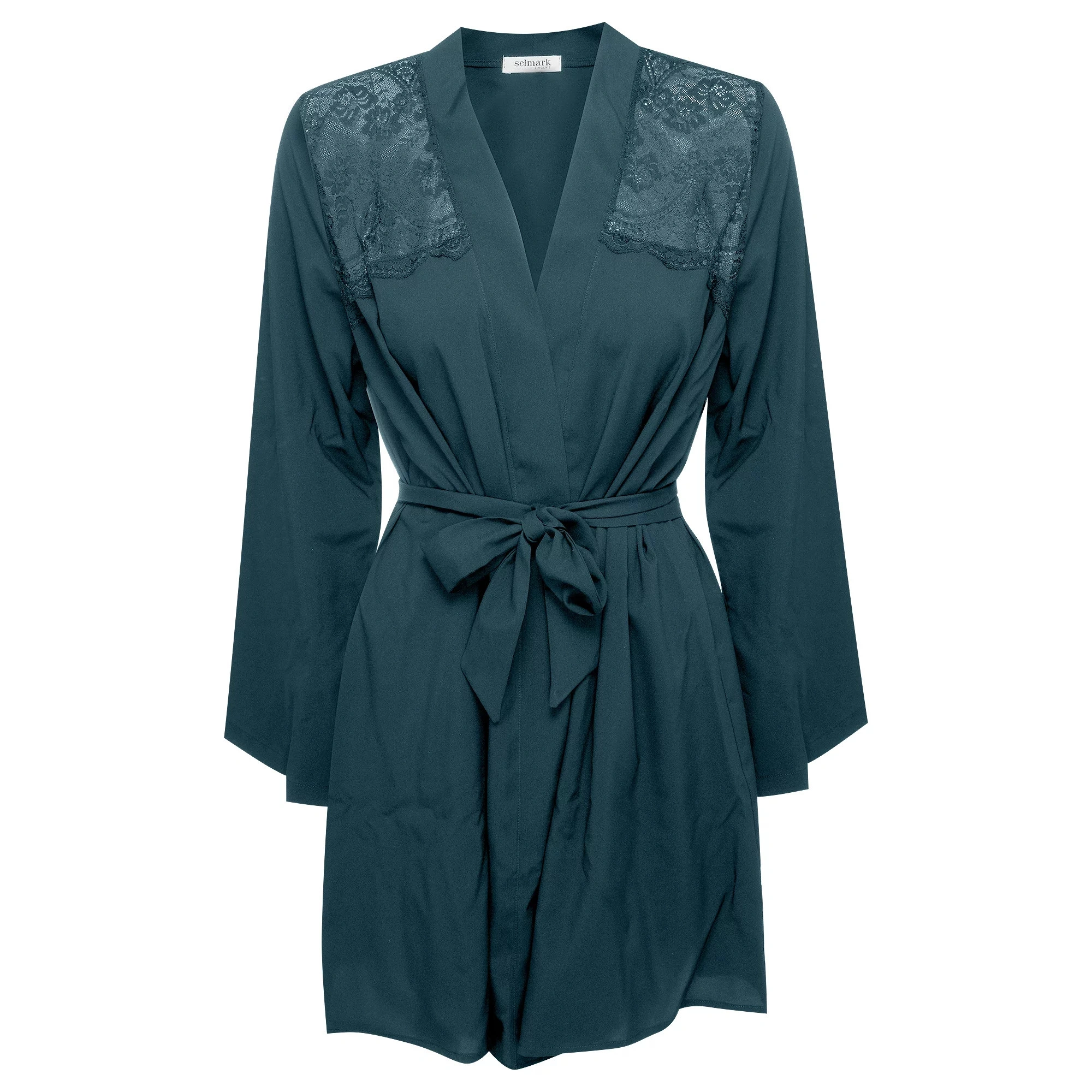 Damski szlafrok Selmark jest ozdobiony delikatną koronką. Długość szlafroka jest krótsza, do kolana, i ma klasyczne wiązanie w talii.