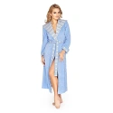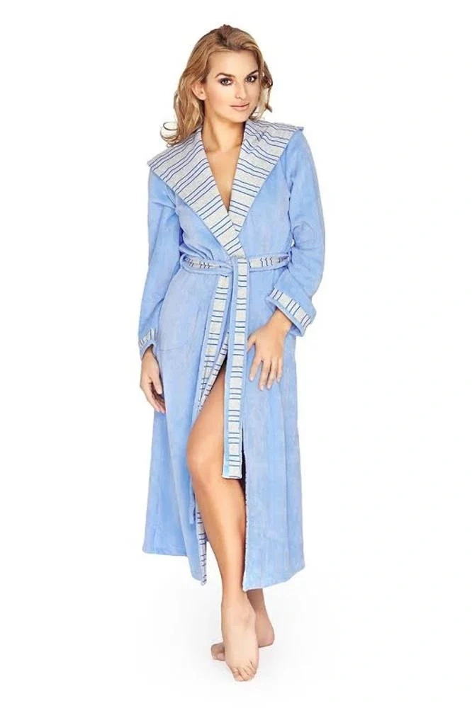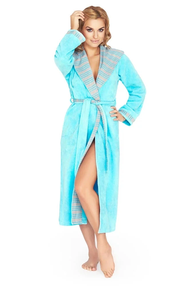 Długi szlafrok damski z kapturem, naszytymi kieszeniami i zapięciem na pasek, wykonany z ciepłego materiału termofrotte. skład: 80% bawełna, 20% poliester