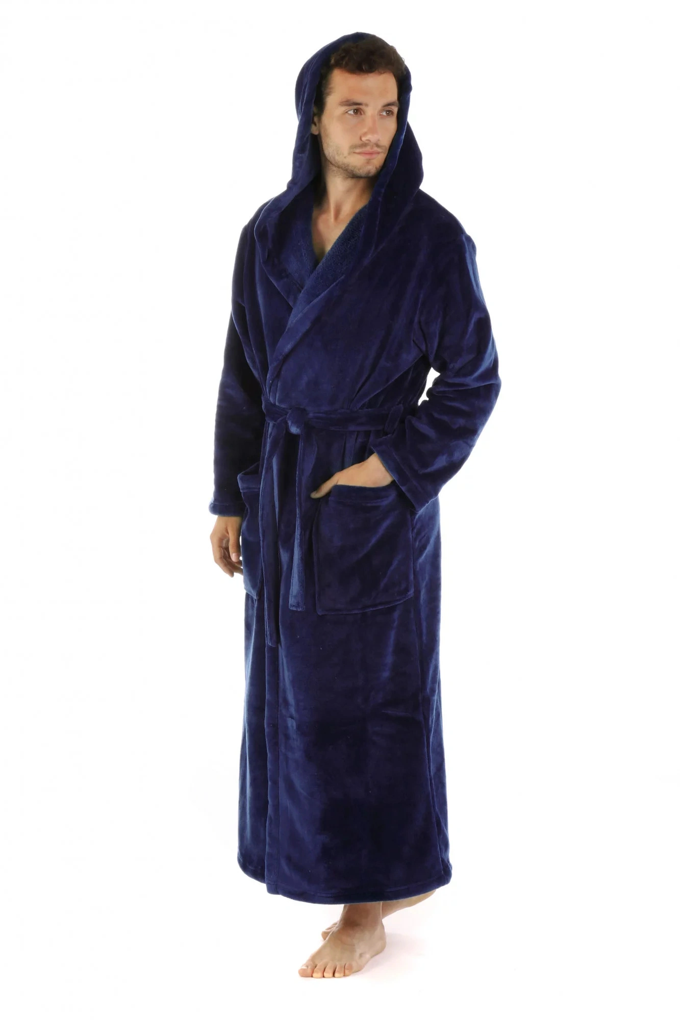 Lekki, miękki i ciepły szlafrok w ciemnoniebieskim kolorze. Szlafrok ma szalowy kołnierz, dwie kiesz
