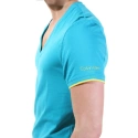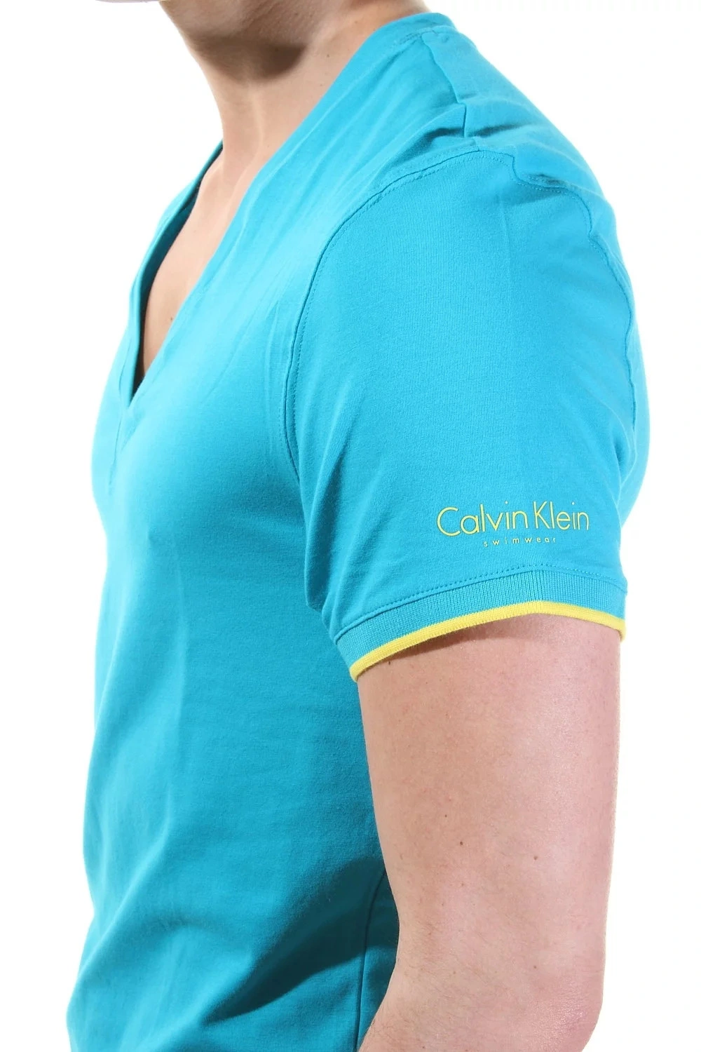 T-shirt 58260Z3 ma dekolt w kształcie litery V, rozcięcia po bokach i krótkie rękawy ozdobione żółtą lamówką i napisem Calvin Klein.
