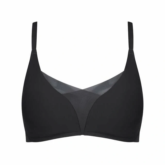 - Překřížená vrstvená síťovina, která utváří hluboký výstřih do V